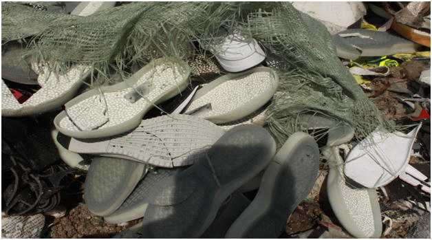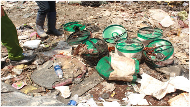 Tại khu xử lý rác, có cả thùng chứa hóa chất lỏng, rác thải cứng nghi là loại đá mài giấy nhám, đế giày bằng cao su..