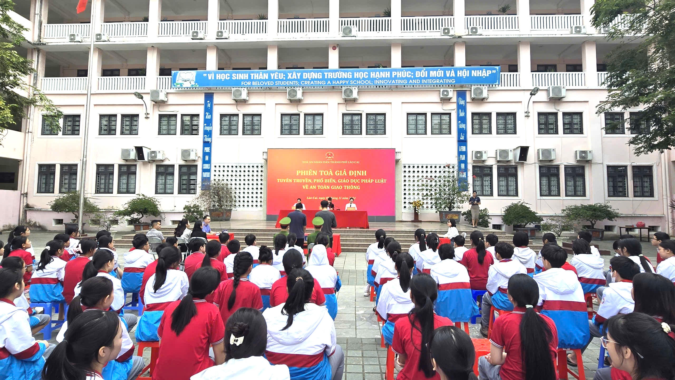 (PLVN) - Hưởng ứng Ngày Pháp luật Việt Nam (9/11), sáng ngày 09/11/2024, tại Trường THCS Lê Quý Đôn, UBND TP Lào Cai phối hợp cùng Sở Tư pháp; Thành Đoàn TP Lào Cai, Hội Luật gia tỉnh Lào Cai, TAND TP Lào cai tổ chức Phiên tòa giả định tuyên truyền pháp luật về An toàn giao thông đường bộ.