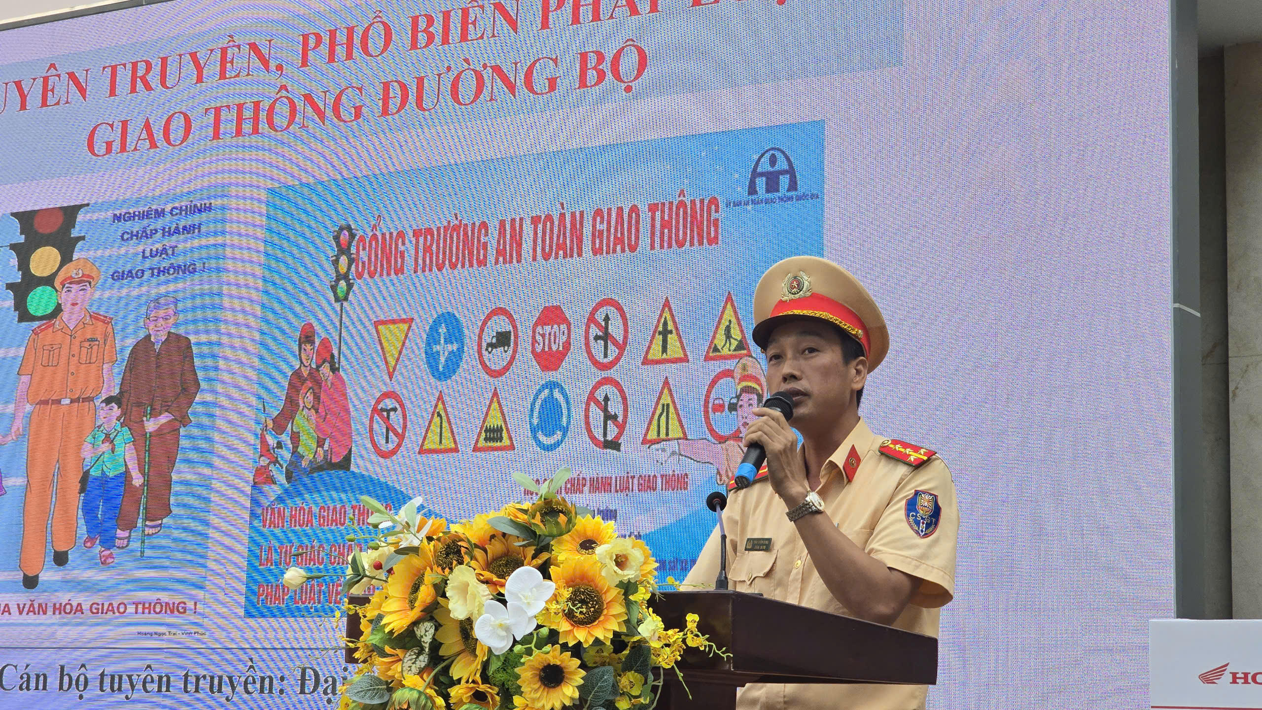 Cán bộ Đội CSGT -TT, Công an TP Lào Cai tuyên truyền các quy định pháp luật về an toàn giao thông. |