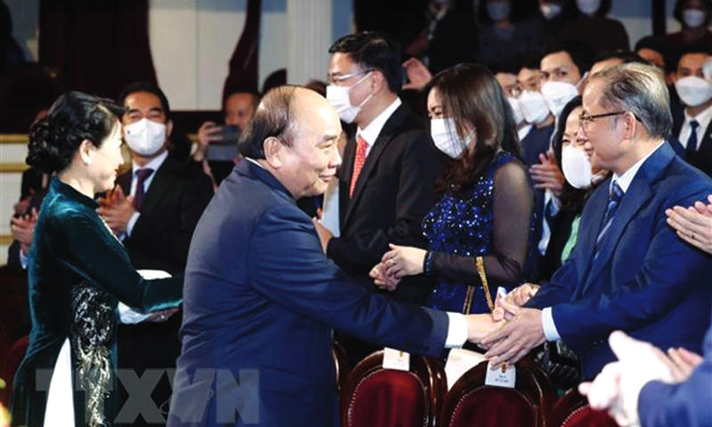 Chủ tịch nước Nguyễn Xuân Phúc gặp gỡ các đại biểu dự Chương trình Xuân Quê hương năm 2022. |