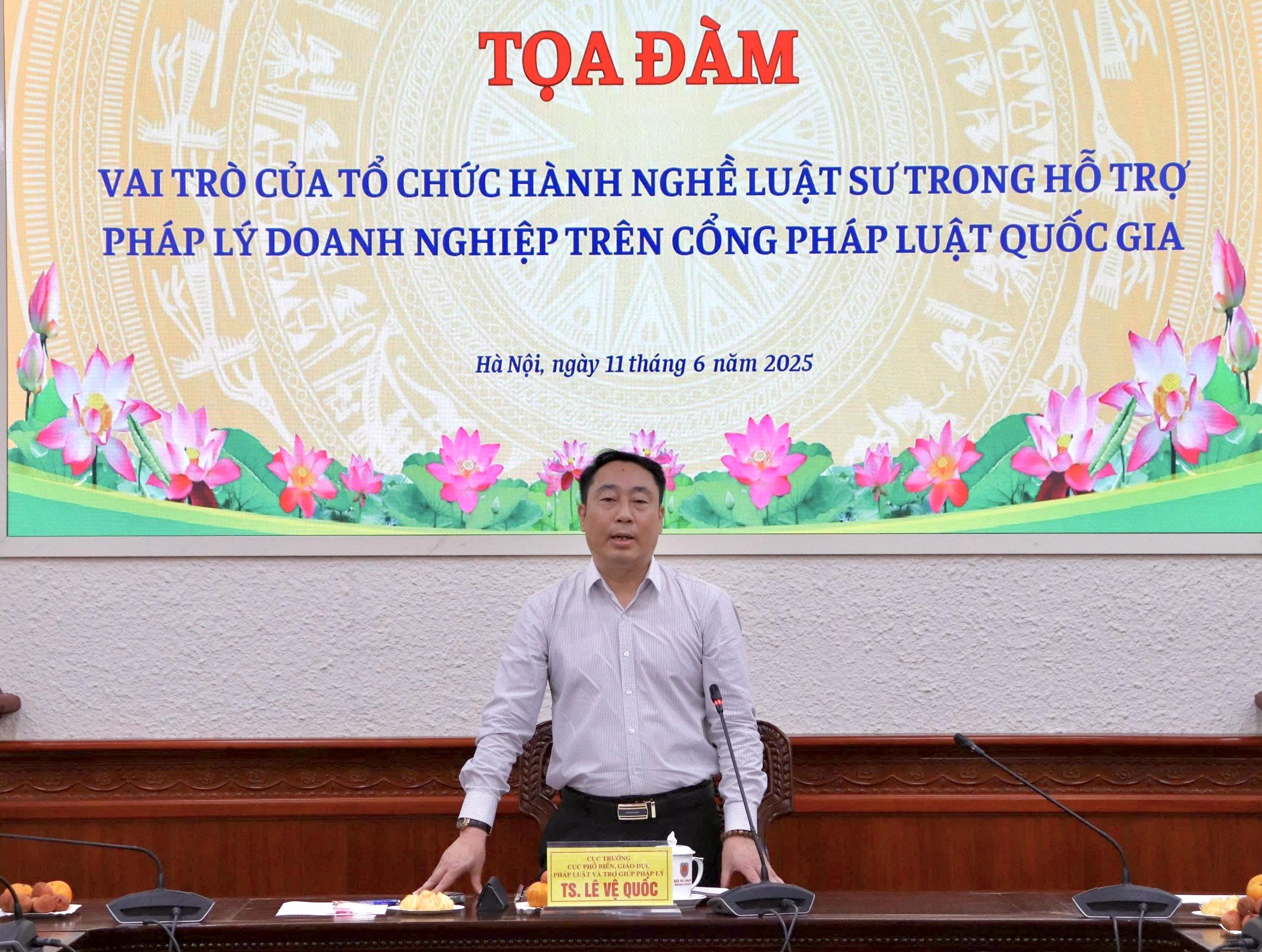 (PLVN) -Ngày 11/6, Cục Phổ biến, giáo dục pháp luật và Trợ giúp pháp lý tổ chức Tọa đàm “Vai trò của tổ chức hành nghề luật sư trong hỗ trợ pháp lý doanh nghiệp trên Cổng Pháp luật quốc gia”. Cục trưởng Cục Phổ biến, giáo dục pháp luật và Trợ giúp pháp lý Lê Vệ Quốc chủ trì Tọa đàm.