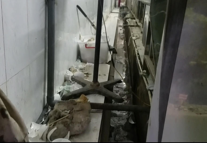 Bên trong khu nhà xưởng chật hẹp, ẩm mốc, đồ đạc, hàng hóa được sắp xếp không theo hàng lối, trông hết sức bừa bộn, phản cảm. Ngay cạnh cửa ra vào là hàng chồng bát, đĩa bẩn được bày la liệt trên nền nhà nhầy nhụa đầy rác rưởi, rất mất vệ sinh. Một bồn nước inox sủi bọt đục ngầu, váng bẩn ngâm bên trong đầy bát, đĩa. Tiếng động cơ cùng tiếng va chạm của bát, đĩa tạo nên âm thanh và cảm giác rất khó chịu khi đứng gần.