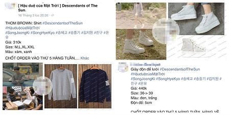 Theo đó, tất cả những sản phẩm xuất hiện trong phim cũng được lùng sục từ son môi, kem chống nắng, đến quần áo, mắt kính… khiến nhiều người phải thốt lên: “Ôi! Sao đâu đâu cũng thấy “Hậu duệ mặt trời” vậy”. Sự “phủ sóng” rộng rãi của bộ phim còn lan sang các cửa hàng cơm như kombo khi họ tận dụng được sức nóng của bộ phim mà đưa ra chương trình giảm giá có tên gọi “Couple – Hậu duệ mặt trời”. Ngay lập tức, lượt chia sẻ tăng đột biến, và rõ ràng chú ý lượt bình luận sẽ thấy lượng đặt bàn cũng tăng.