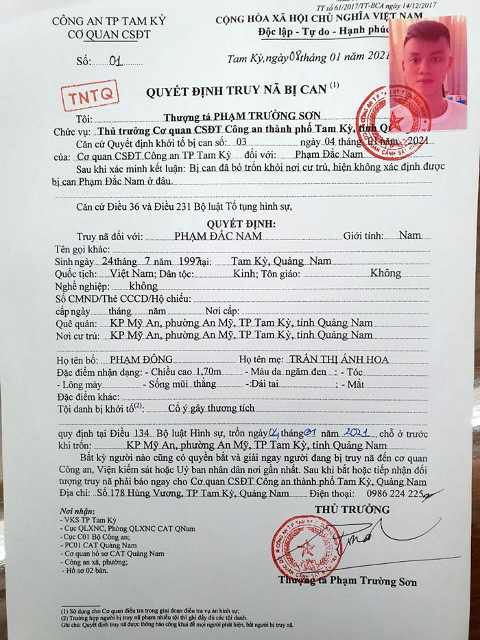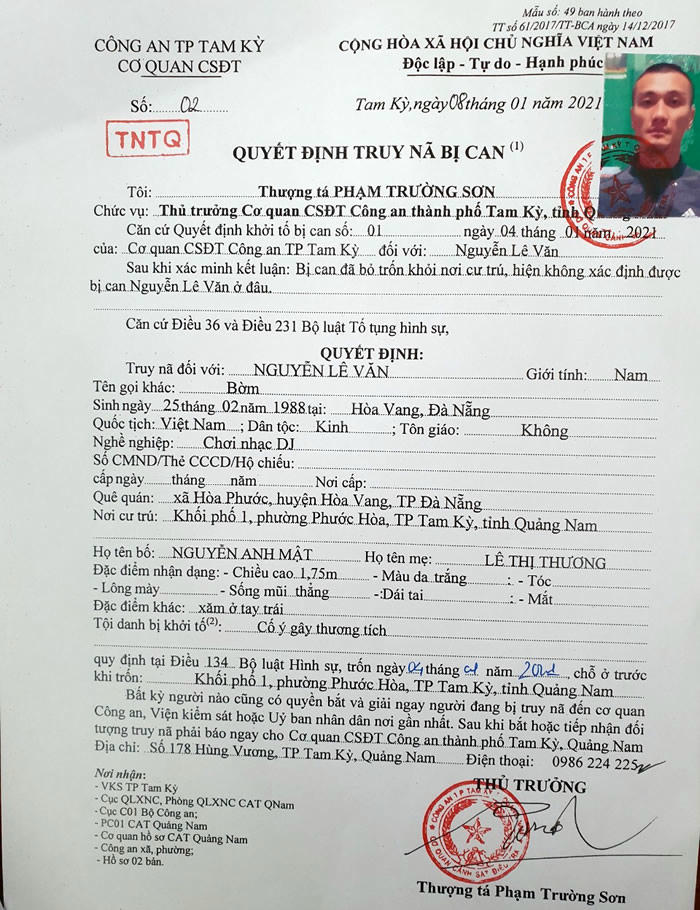 Cụ thể, ngày 8/1, Cơ quan CSĐT CATP Tam Kỳ (Quảng Nam) đã ra lệnh truy nã 2 đối tượng gồm: Nguyễn Lê Văn (1998, trú xã Hòa Phước, H. Hòa Vang, TP Đà Nẵng) và Phạm Đắc Nam (1997, trú P. An Mỹ, TP Tam Kỳ) về hành vi “Cố ý thương tích”.