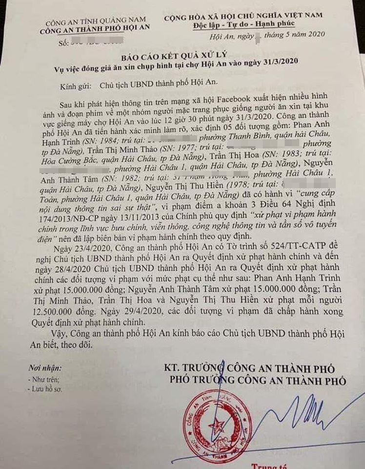 Ngày 1/4, nhóm người trên chủ động đến Công an phường Minh An trình diện, khai báo sự việc. Nhóm người phụ nữ tường trình, vào ngày 31/3, họ đi trên 2 xe ô tô vào Hội An để mua đồ đạc phục vụ việc kinh doanh (quán café), sau đó chụp hình và quay clip diễn cảnh xin ăn để làm kỷ niệm.