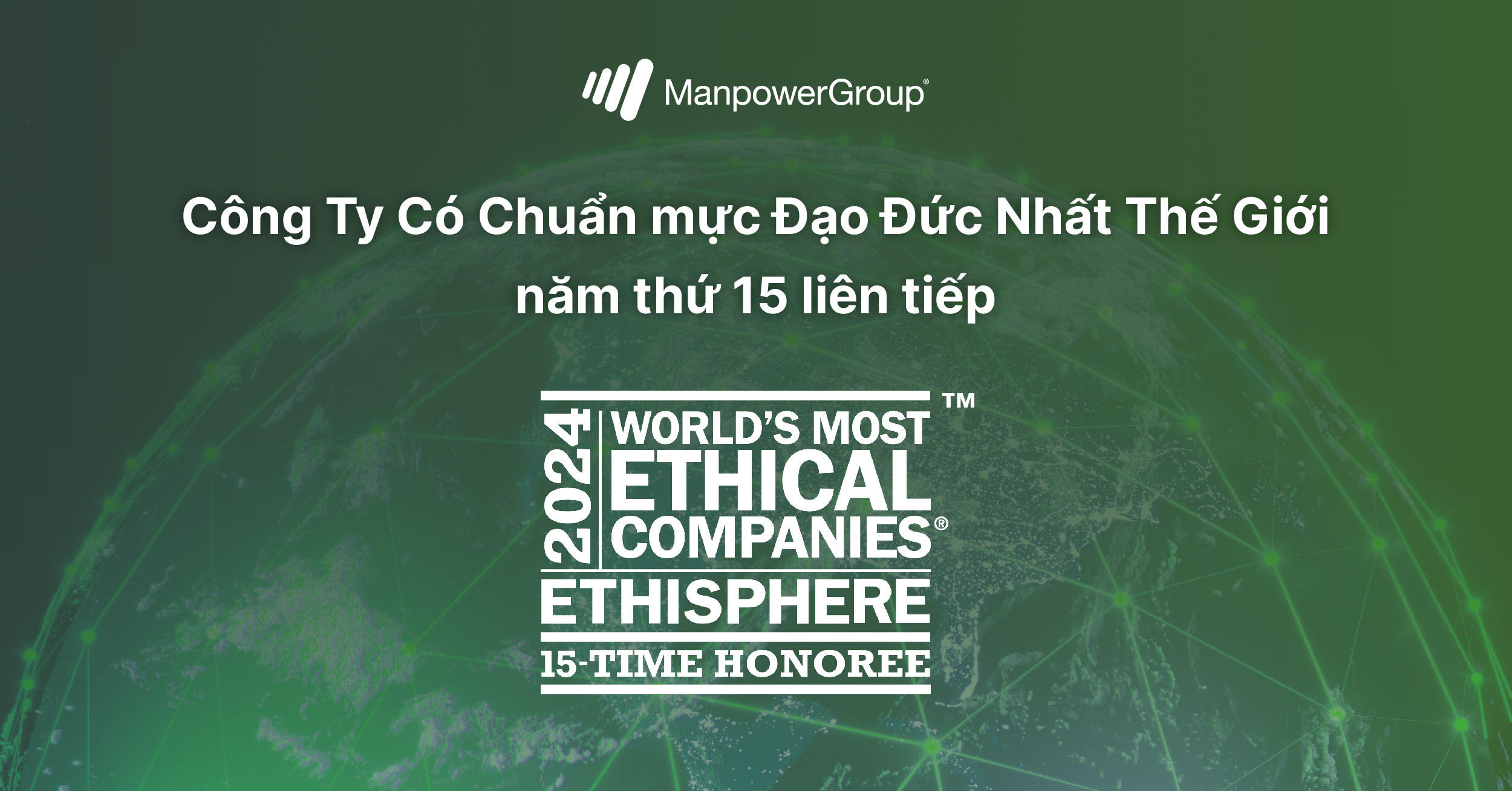 Năm 2024, Ethisphere - công ty danh giá thế giới về xác định và thúc đẩy các tiêu chuẩn về thực hành kinh doanh có đạo đức - đã vinh danh ManpowerGroup là một trong những Công ty có chuẩn mực đạo đức nhất thế giới, đánh dấu năm thứ 15 liên tiếp nhận được vinh dự này.