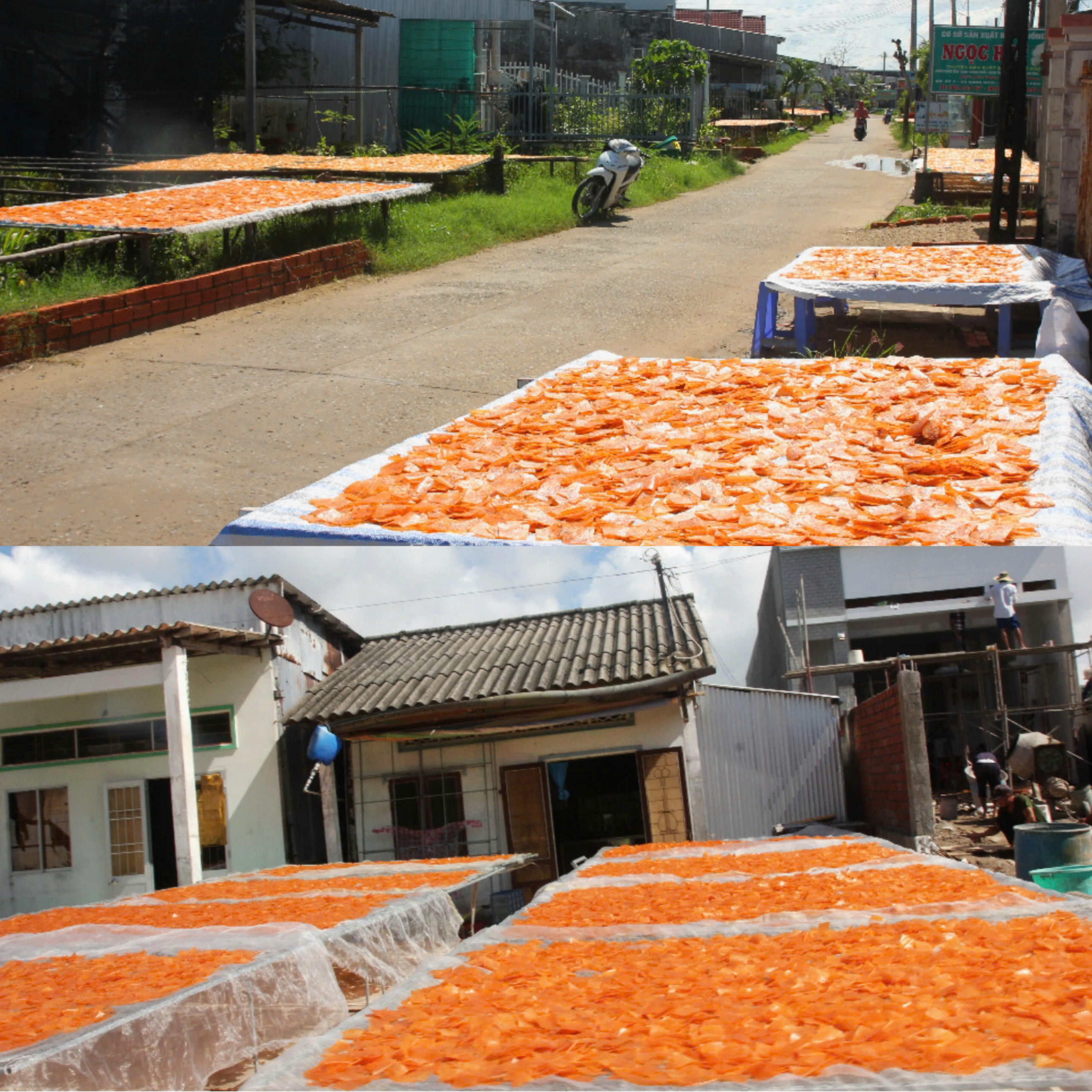 Bánh phồng tôm phơi đến khi khô ráo, đạt độ dẻo nhất định sẽ được cắt thủ công thành những miếng nhỏ rồi lại đem phơi thêm 1 ngày nắng. |