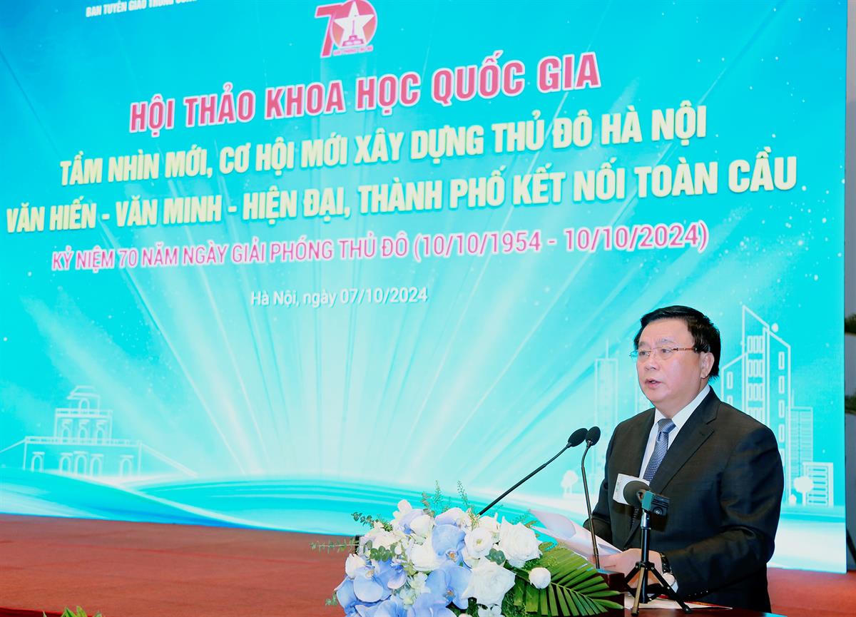 (PLVN) - Ngày 7/10, Ban Tuyên giáo Trung ương, Học viện Chính trị Quốc gia Hồ Chí Minh, Bộ Quốc phòng, Bộ Công an và Thành ủy Hà Nội phối hợp tổ chức Hội thảo khoa học quốc gia “Tầm nhìn mới, cơ hội mới xây dựng Thủ đô Hà Nội văn hiến - văn minh - hiện đại, TP kết nối toàn cầu”. Đây là một trong hai sự kiện cấp quốc gia chào mừng kỷ niệm 70 năm Ngày Giải phóng Thủ đô (10/10/1954 - 10/10/2024) do TP Hà Nội phối hợp tổ chức.