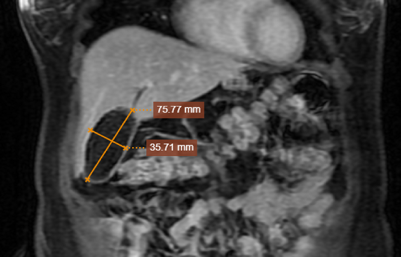 Chụp cộng hưởng từ cho thấy túi mật chứa đầy sỏi, kích thước 78x25mm |