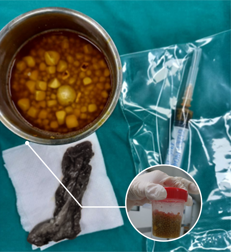 Hàng trăm viên sỏi túi mật và túi mật được ê-kíp bác sĩ lấy ra an toàn cho bệnh nhân |