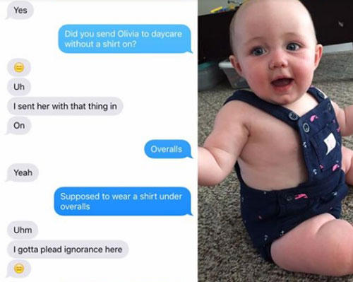Hawley sau đó không thể nhịn cười khi thấy cô con gái chỉ mặc nguyên chiếc yếm, không hề có áo phông hay sơ mi bên trong. Khi Hawley nhắn tin hỏi tại sao chồng mặc cho con như vậy, anh chồng nói tưởng chỉ cần như thế là đủ.
