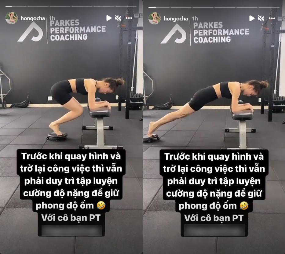 Trên Instagram cá nhân, Hồ Ngọc Hà vừa đăng tải loạt story hé lộ khoảnh khắc cô đang chăm chỉ luyện tập tại nhà. Có thể thấy, nữ ca sĩ sẵn sàng thử sức với những động tác khó. Giọng ca Cả Một Trời Thương Nhớ chia sẻ: "Trước khi quay hình và trở lại công việc thì vẫn phải duy trì luyện tập cường độ nặng để giữ phong độ ốm".
