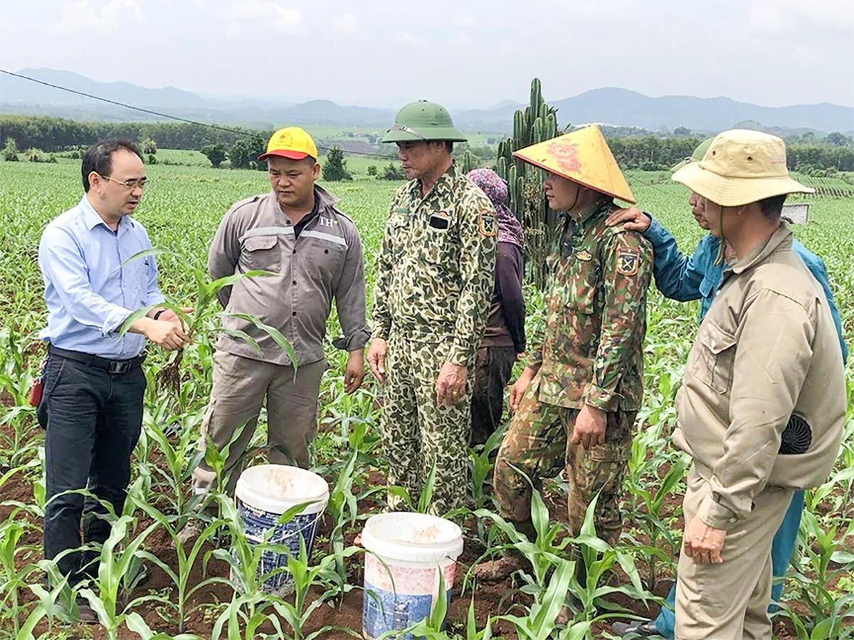 Anh Nguyễn Bá Trường (trái) hướng dẫn các hộ dân kỹ thuật trồng ngô sinh khối làm nguyên liệu cho Tập đoàn TH. Ảnh tư liệu