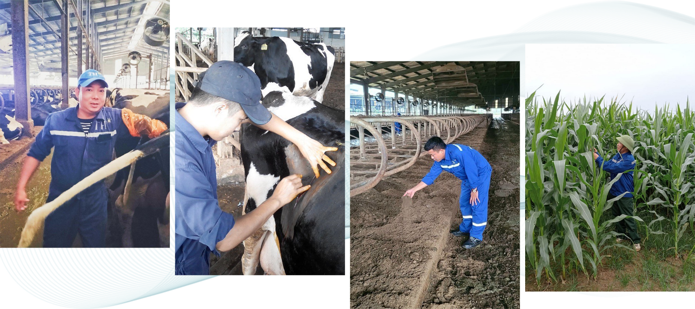 Các đảng viên đang làm việc tại các cụm trang trại TH gồm Bác sĩ thú y Nguyễn Hữu Bình khám sức khỏe cho bò sữa trước khi phối giống; Bác sĩ thú y Nguyễn Thế Lương chuyên khoa mổ cho bò sữa; Anh Nguyễn Cảnh Toàn, kỹ thuật trang trại đang kiểm tra chất lượng đệm sinh học nền chuồng bò sữa; Anh Phạm Xuân Quang, đội trưởng đội sản xuất đang kiểm tra mức độ phát triển của cây ngô. Ảnh: Vũ Toàn