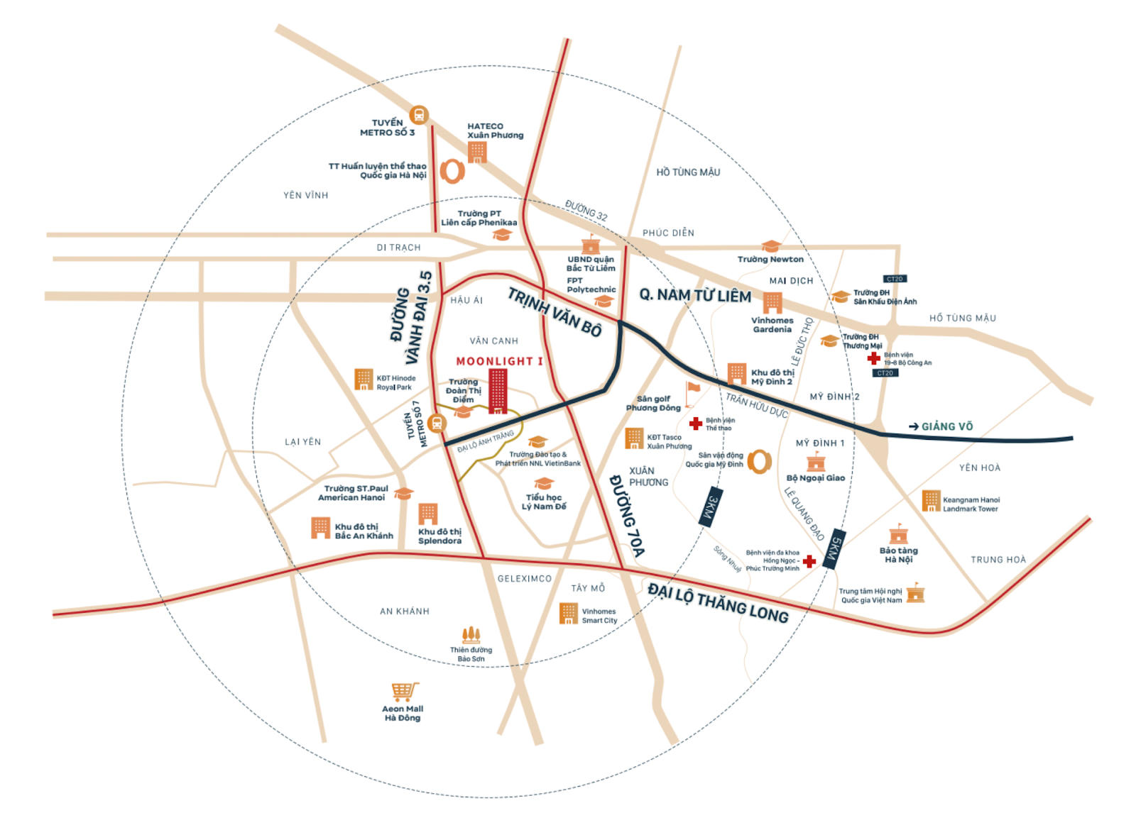 Toạ lạc tại vị trí trung tâm khu đô thị, Moonlight 1 thừa hưởng trọn vẹn bản đồ “siêu kết nối” của dự án “mẹ”. Từ đây, chỉ 10 phút cư dân dễ dàng kết nối với trung tâm Mỹ Đình, 5-7 phút tới các trường học chất lượng cao, bệnh viện quốc tế và các trung tâm mua sắm - giải trí hàng đầu như: Aeon Mall Hà Đông, Big C, Vincom Mega Mall, TTTM Keangnam, ...