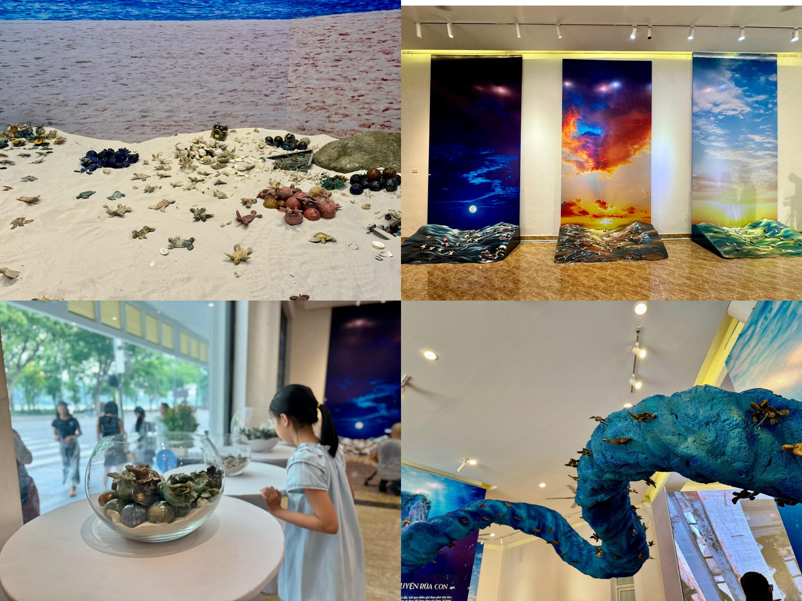 Bên cạnh không gian độc đáo, nhân vật chính thu hút người tham quan chính là 1001 chú rùa biển bằng gốm được sắp đặt tài tình tại từng bối cảnh. Ở nơi biển xanh, cát trắng, nắng vàng các chú rùa biển như đang tung tăng chơi đùa giữa thiên nhiên, hay ở góc tái hiện bình minh, giữa đại dương bao la các chú rùa biển giống như đang đi theo hướng mặt trời. 1001 rùa biển xuất hiện trong triển lãm gồm 1000 trứng, con non, rùa biển và 1 rùa cái trưởng thành có kích thước 1,5m x 1,5m đang mang bầu. Đây là lần đầu tiên tại Việt Nam có một triển lãm nghệ thuật với con số kỷ lục 1001 rùa biển bằng gốm.