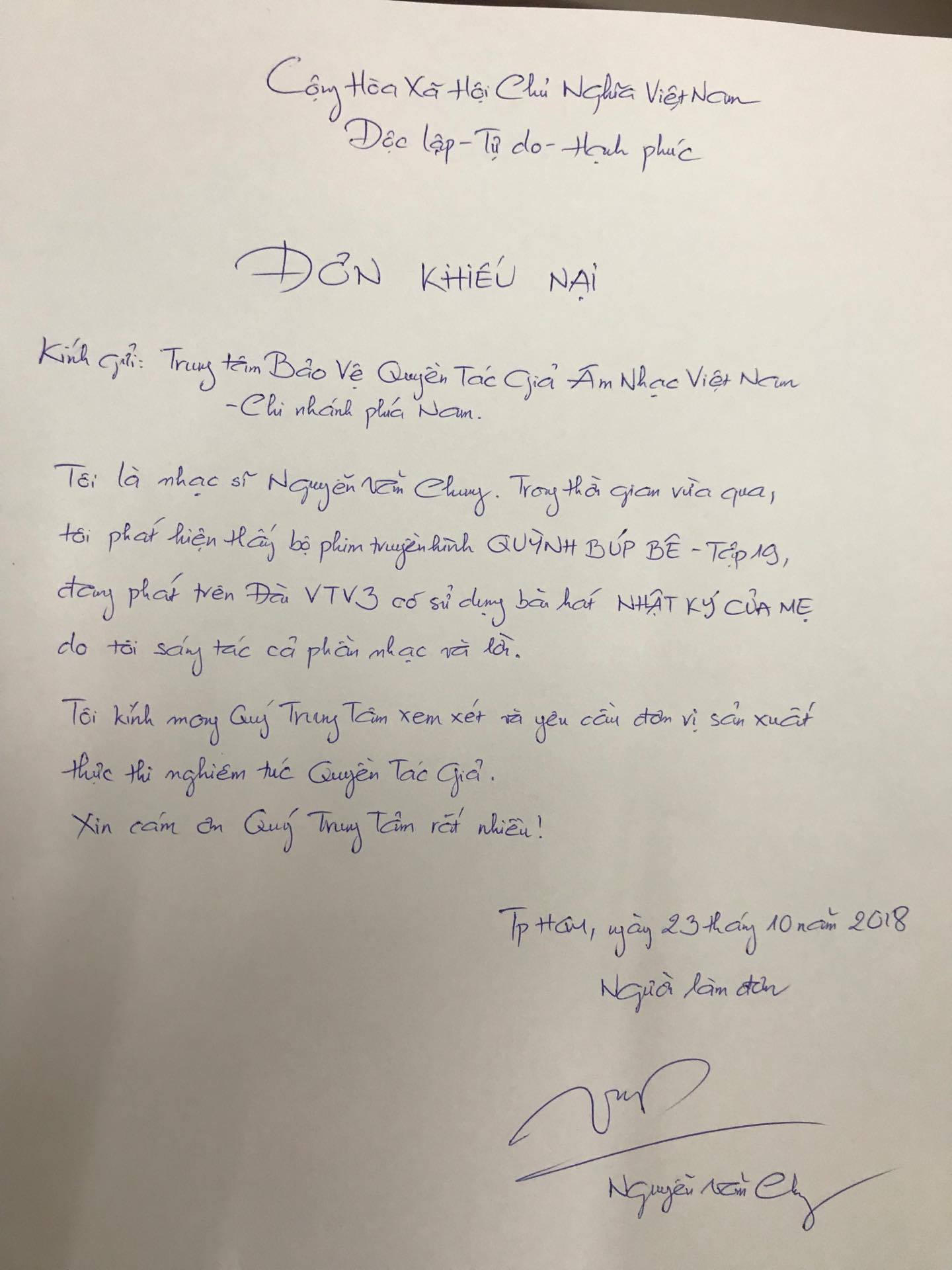 Trong đơn khiếu nại, Nhạc sĩ Nguyễn Văn Chung viết: " Trong thời gian vừa qua, tôi phát hiện thấy bộ phim truyền hình Quỳnh búp bê - tập 19 đang phát trên đài VTV3 có sử dụng bài hát Nhật ký của mẹ do tôi sáng tác cả phần nhạc và lời. Tôi kính mong Quý trung tâm xem xét và yêu cầu đơn vị sản xuất thực thi nghiêm túc Quyền tác giả".