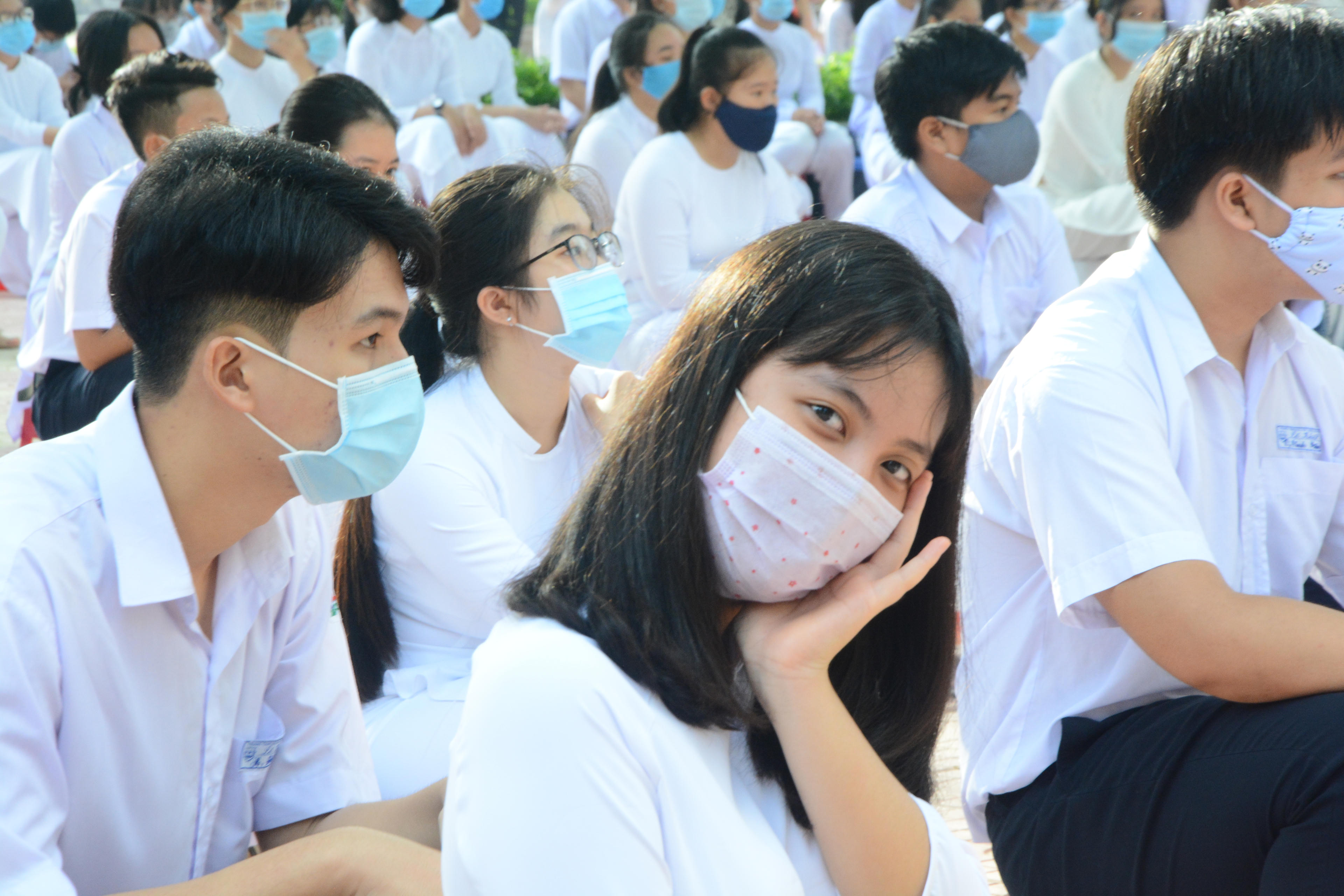 Khác với lễ khai giảng các năm học trước, do ảnh hưởng của dịch Covid-19 nên chỉ học sinh lớp 10, các khối lớp khác cử lớp trưởng, lớp phó dự lễ. Tất cả học sinh đeo khẩu trang, ngồi đảm bảo giãn cách 1m.