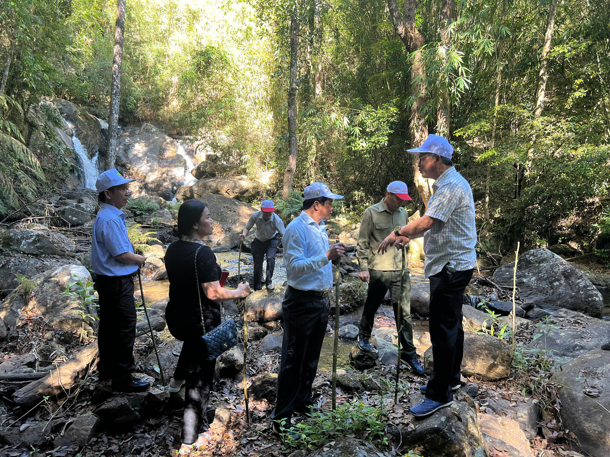 Ông Nguyễn Đức Tuy - Phó Bí thư Tỉnh uỷ Kon Tum (bên trái) xuyên rừng khảo sát các điểm du lịch. |