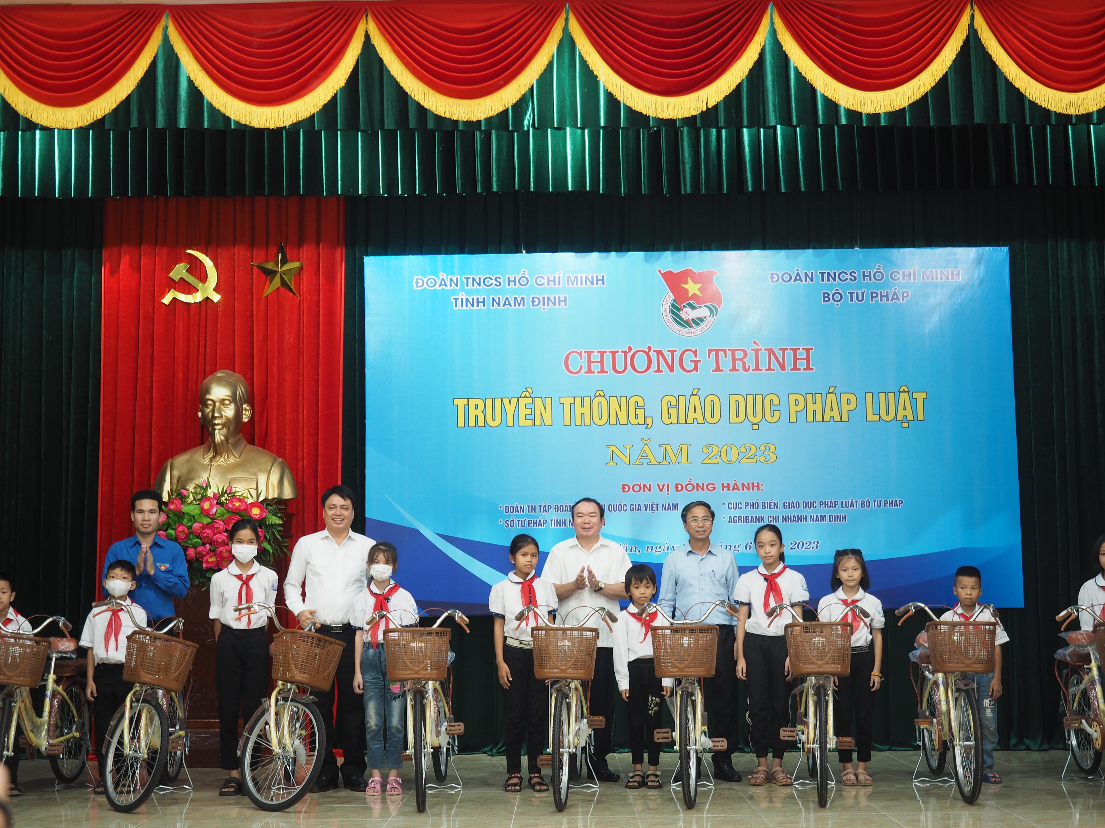 Phó Bí thư Thường trực Đảng ủy Bộ Tư pháp Nguyễn Kim Tinh, Trưởng Ban Dân vận Tỉnh ủy Nam Định Trần Minh Thắng trao 20 chiếc xe đạp cho các em học sinh có hoàn cảnh khó khăn. |