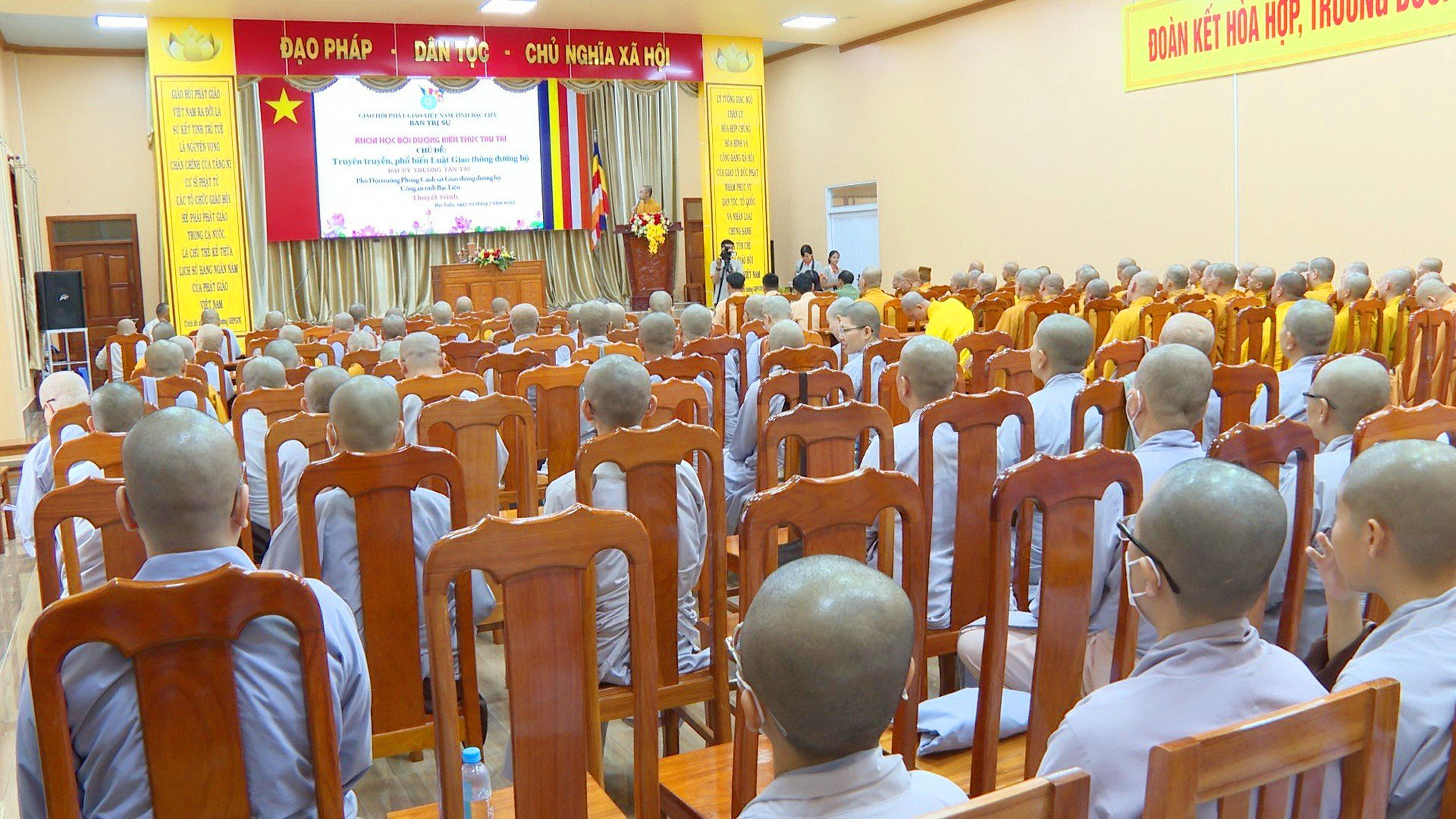 Tại buổi tuyên truyền, phổ biến Luật giao thông đường bộ, các tăng, ni đã được cán bộ Phòng Cảnh sát Giao thông đường bộ Công an tỉnh Bạc Liêu thông tin về một số nội dung liên quan đến công tác đảm bảo trật tự an toàn giao thông trên địa bàn tỉnh trong 6 tháng đầu năm 2023.