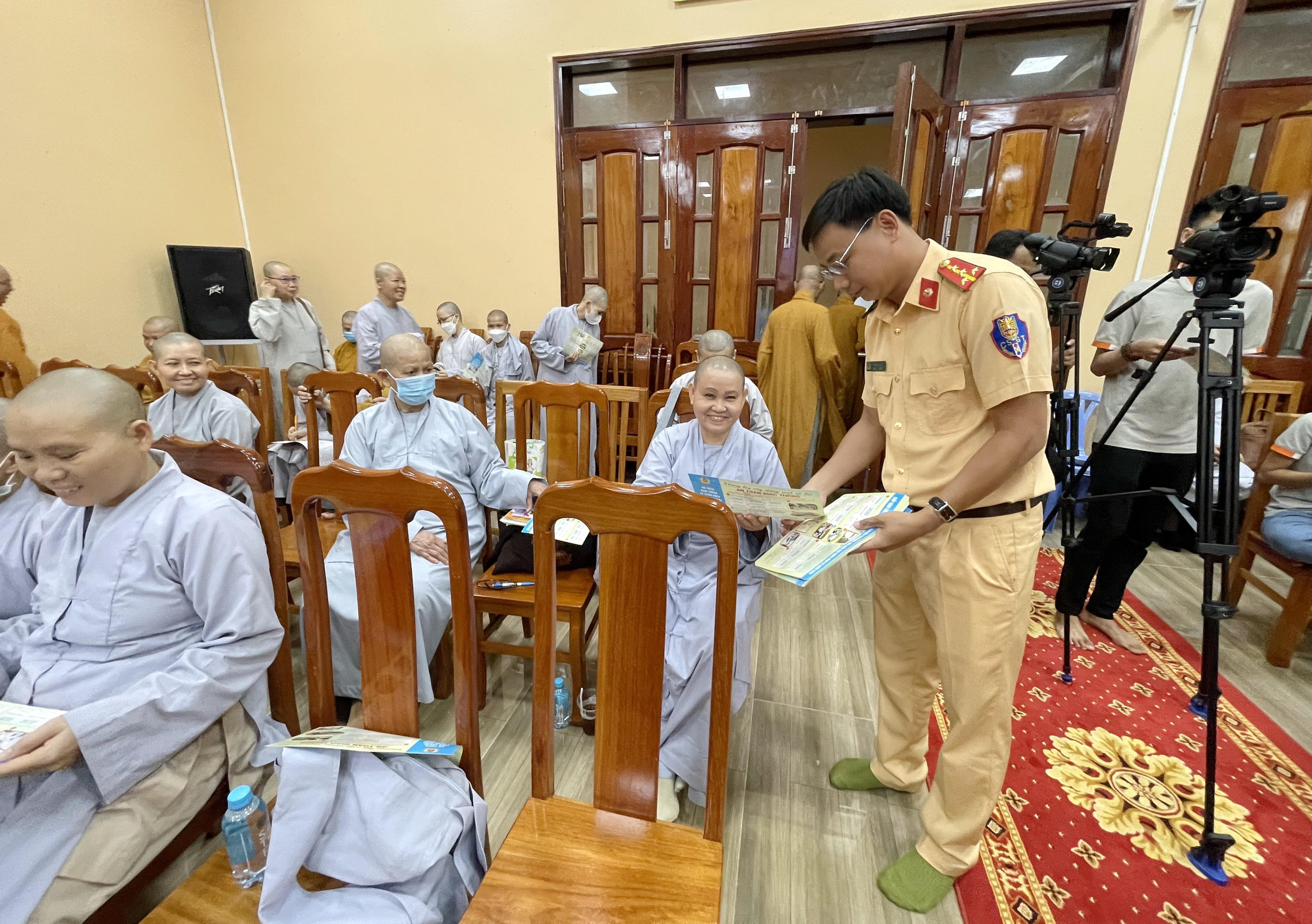 Đồng thời, các tăng, ni còn được tuyên truyền hướng dẫn các quy tắc khi tham gia giao thông như: đi đúng phần đường, làn đường, tốc độ quy định cho phép khi xe lưu thông ở tuyến đường có dãy phân cách cố định và không cố định; quy định độ tuổi điều khiển phương tiện giao thông; cách nhận biết và sử dụng nón bảo hiểm đạt chuẩn chất lượng…