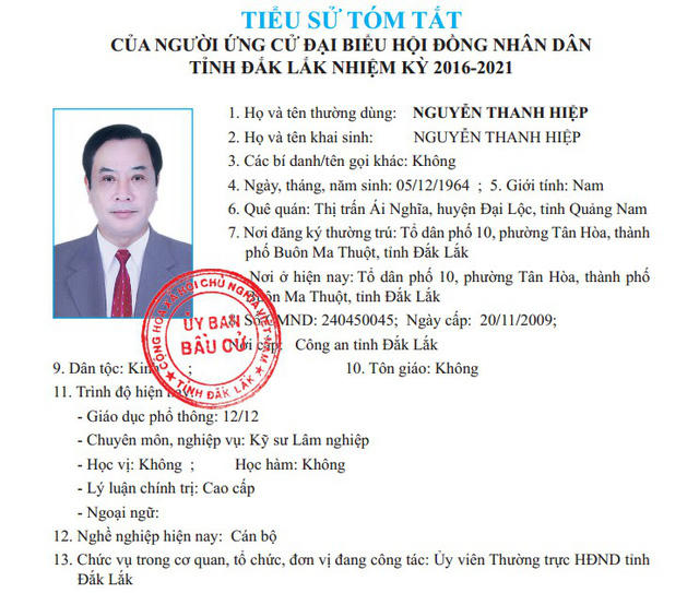 (PLO) - Dù chưa có bằng đại học nhưng trong hồ sơ lý lịch, Phó Chủ tịch HĐND tỉnh Đắk Lắk Nguyễn Thanh Hiệp vẫn khai có trình độ chuyên môn nghiệp vụ là kỹ sư lâm nghiệp. Giải thích sự việc này, ông Hiệp cho là “do yếu tố lịch sử”.