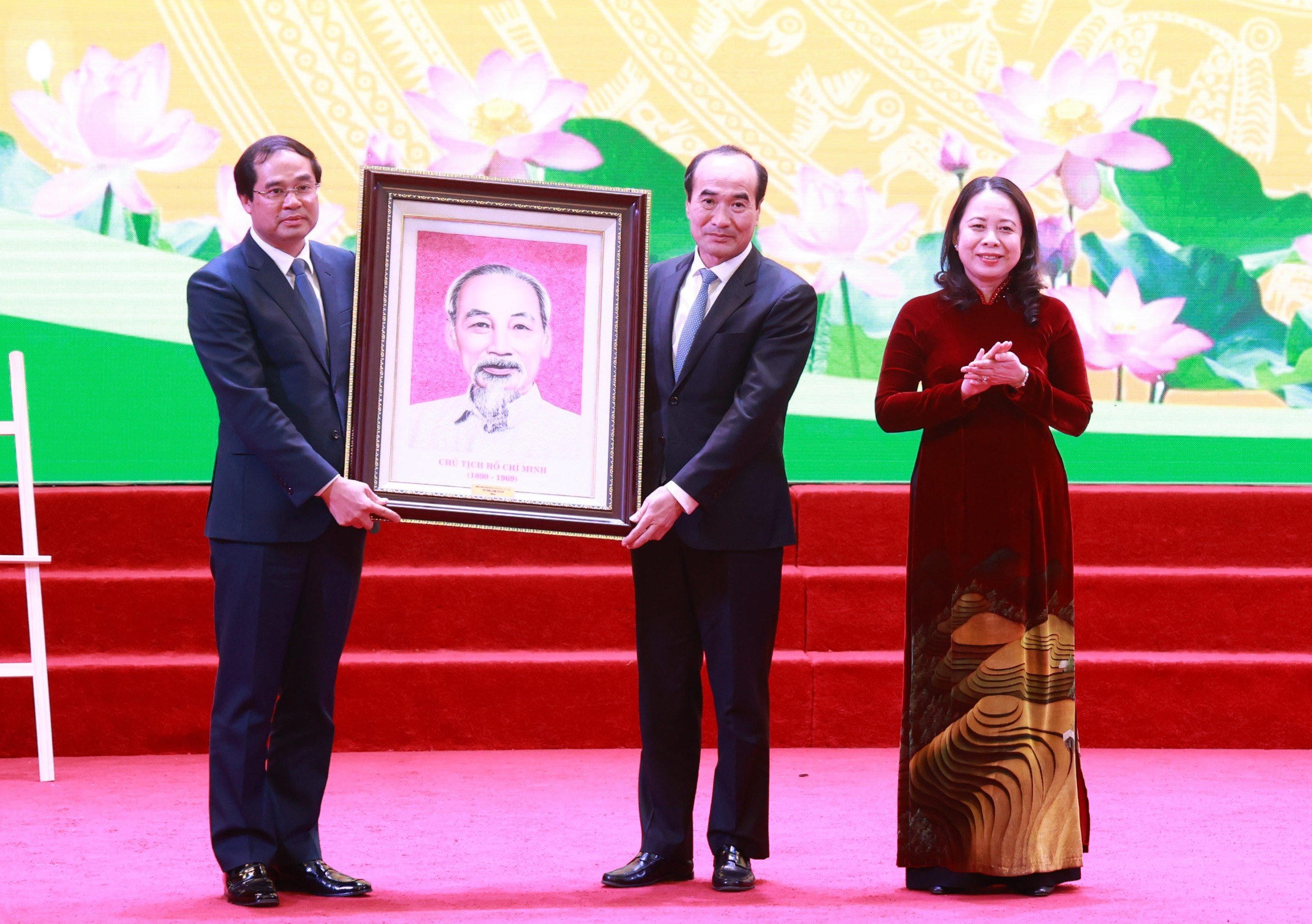 Phó Chủ tịch nước Võ Thị Ánh Xuân tặng ảnh lưu niệm Bác Hồ cho tỉnh Lào Cai. |