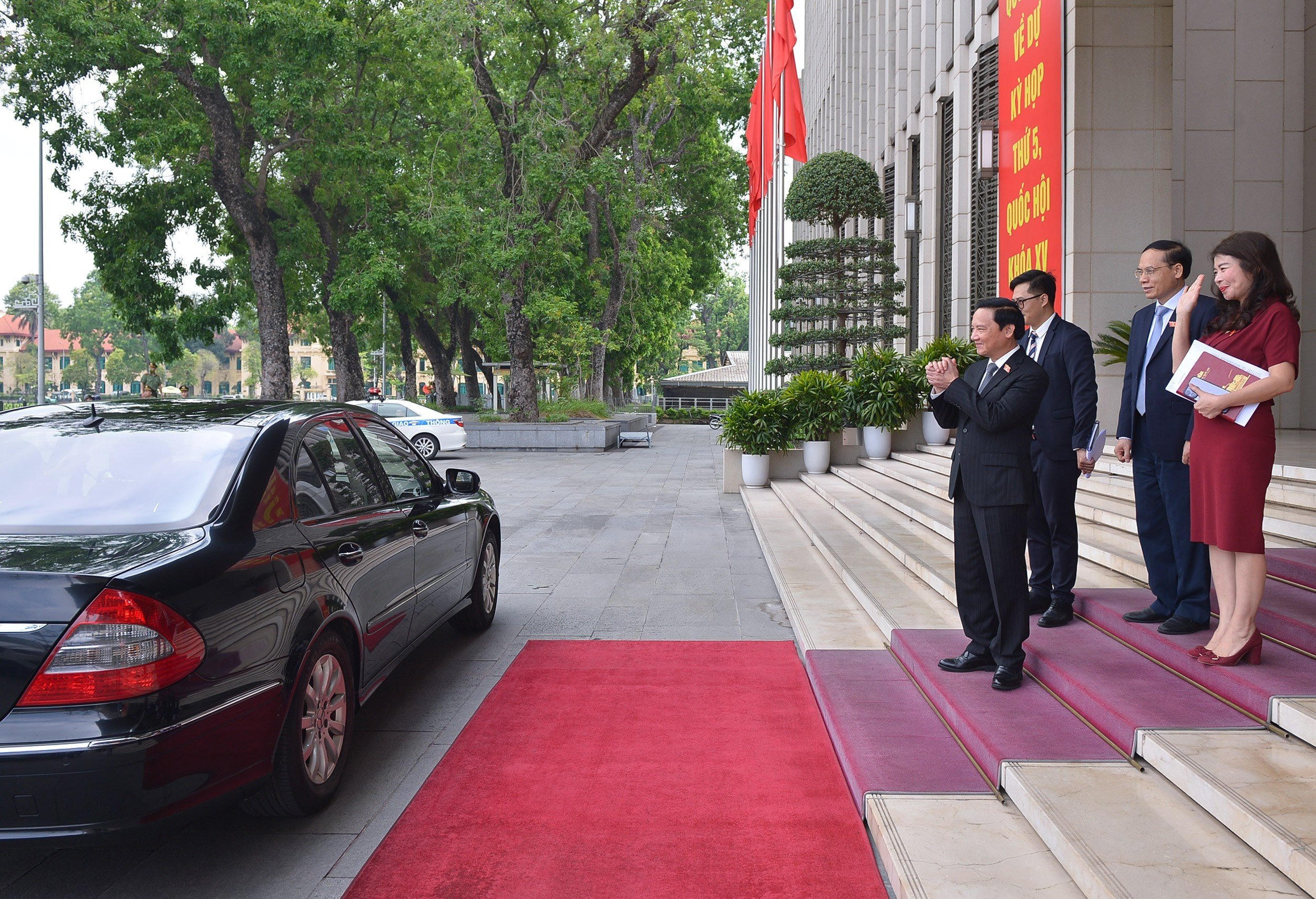 Phó Chủ tịch Quốc hội Nguyễn Khắc Định và các đại biểu tiễn Bộ trưởng Bộ Tư pháp Cuba Oscar Manuel Slivera Martinez rời Nhà Quốc hội.
