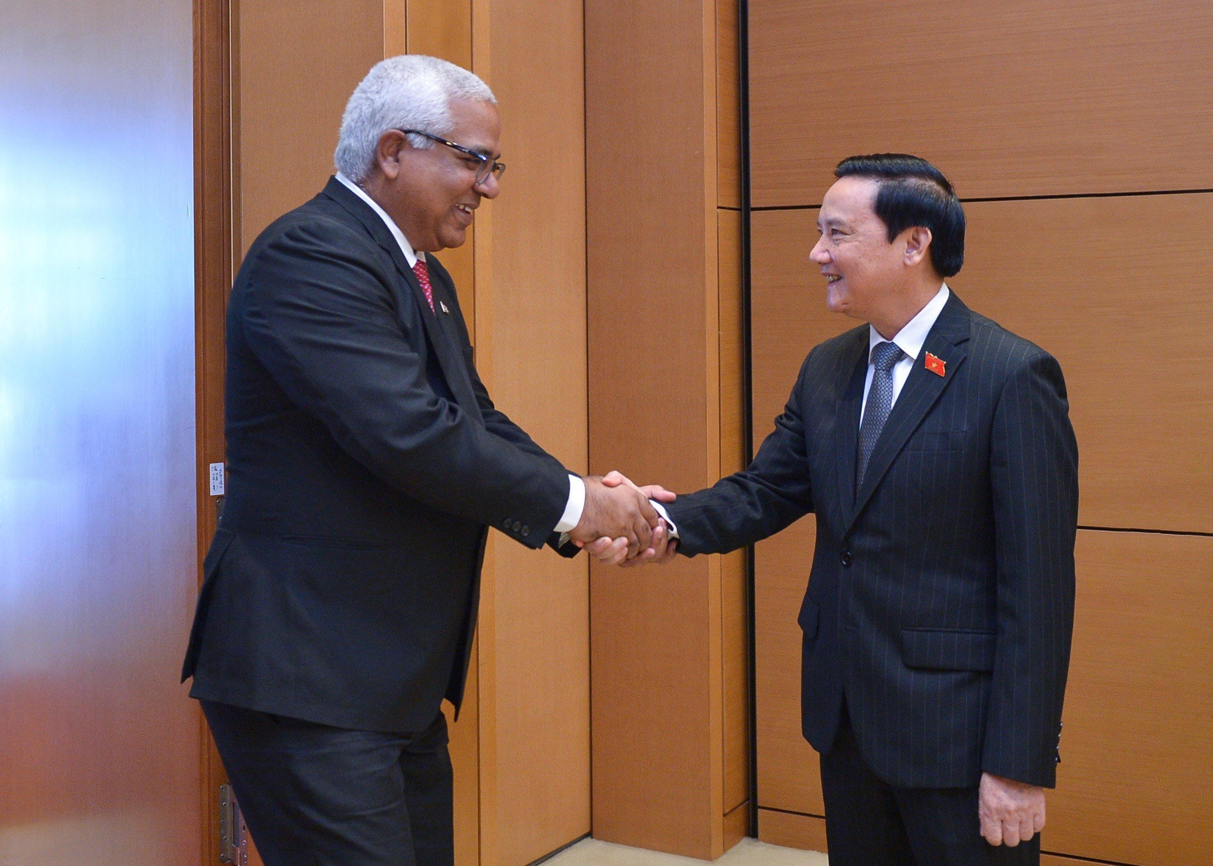 Phó Chủ tịch Quốc hội Nguyễn Khắc Định chào đón Bộ trưởng Bộ Tư pháp Cuba Oscar Manuel Slivera Martinez.