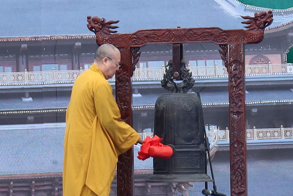 Hòa thượng Thích Thanh Nhiễu, Phó Chủ tịch Thường trực Hội đồng Trị sự Giáo hội Phật giáo Việt Nam, Trụ trì chùa Tam Chúc thỉnh chuông khai hội. |