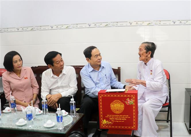 Dịp này, Phó Chủ tịch Thường trực Quốc hội Trần Thanh Mẫn cùng Đoàn công tác đến thăm, chúc Tết, tặng quà Mẹ Việt Nam anh hùng Phùng Thị Khéo tại thị trấn Minh Lương, huyện Châu Thành, tỉnh Kiên Giang.