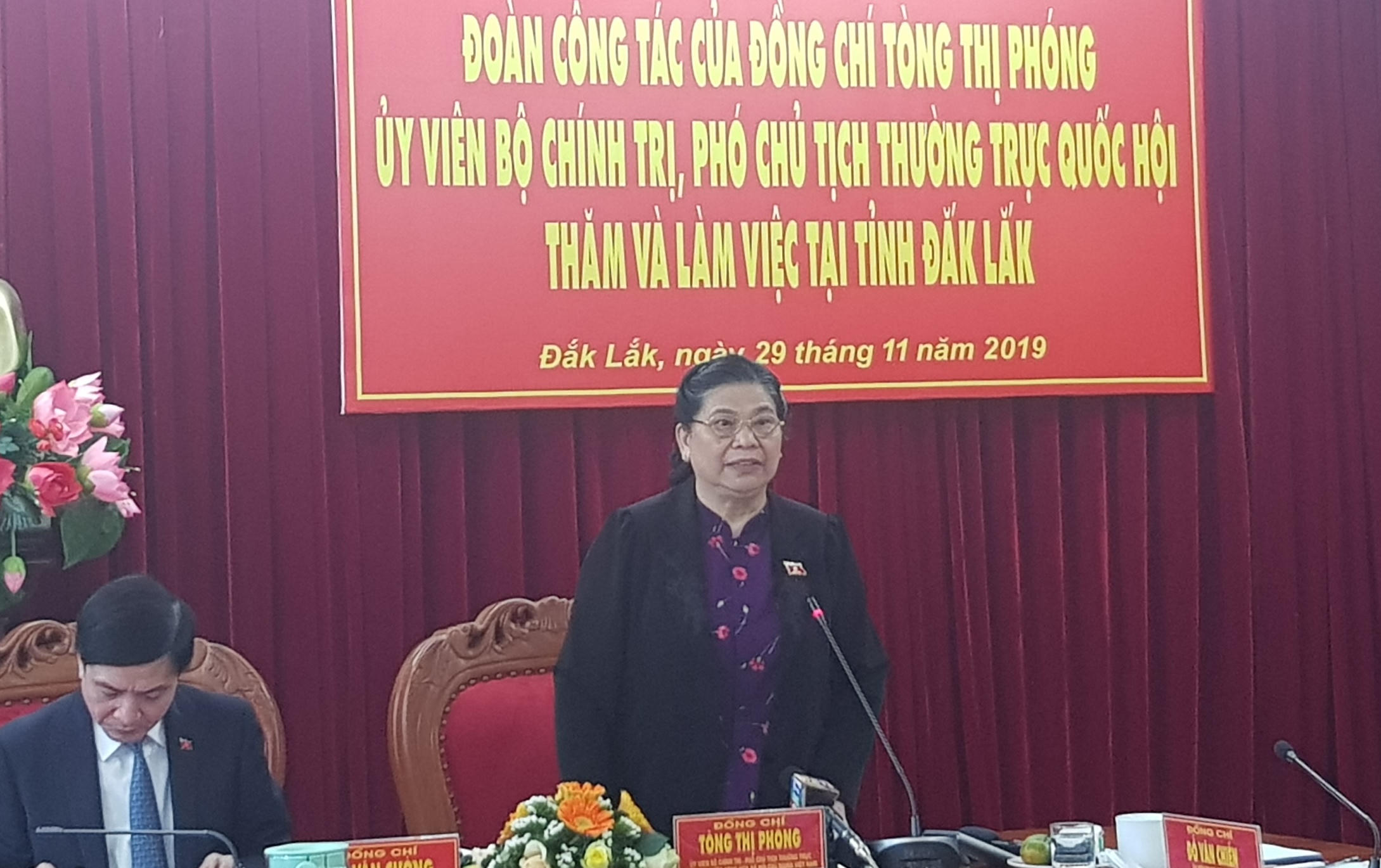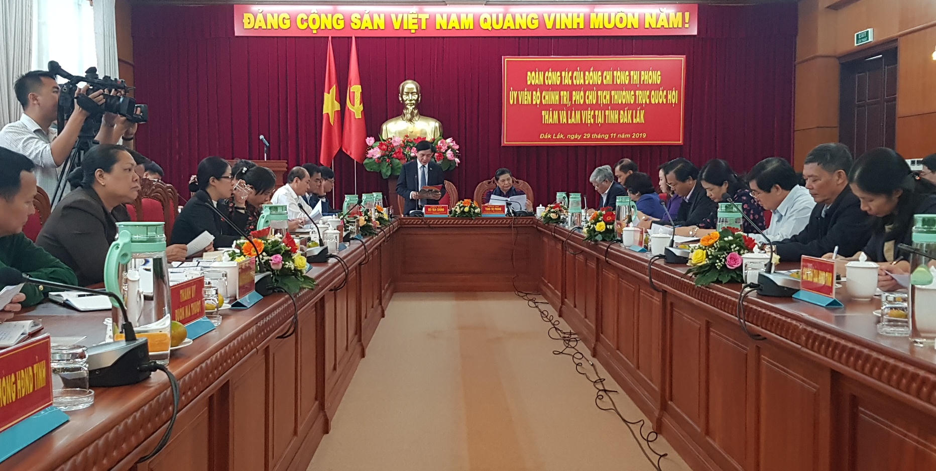 (PLVN) -Chiều ngày 29/11, Đoàn công tác của Quốc hội do bà Tòng Thị Phóng, Uỷ viên Bộ Chính trị, Phó chủ tịch Thường trực Quốc hội dẫn đầu đã có buổi làm việc với Ban thường vụ (BTV) tỉnh uỷ Đắk Lắk về tình hình thực hiện nhiệm vụ chính trị năm 2019, phương hướng nhiệm vụ năm 2020 và quán triệt “Đề án tổng thể phát triển kinh tế - xã hội vùng đồng bào dân tộc thiểu số và miền núi giai đoạn 2021-2030”.