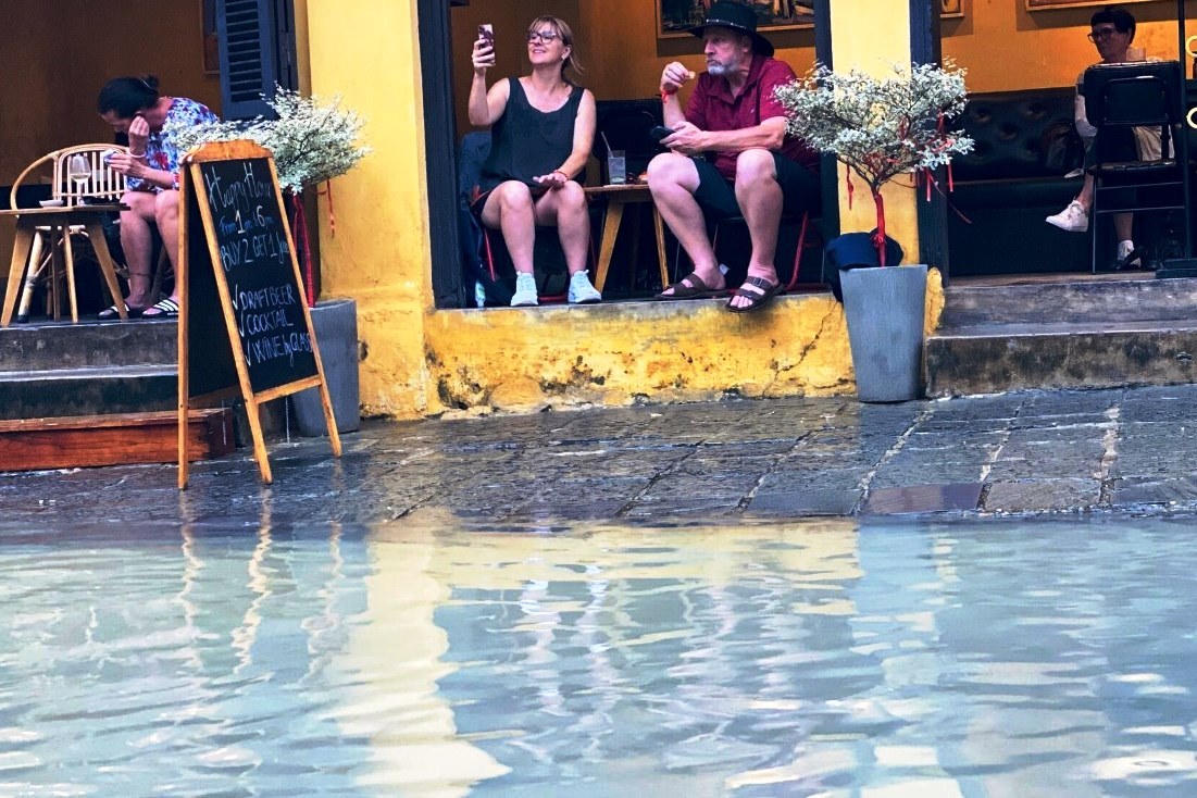 Du khách ngồi thưởng thức cà phê và ghi lại hình ảnh nước lũ đang gây ngập tuyến đường phía trước quán.