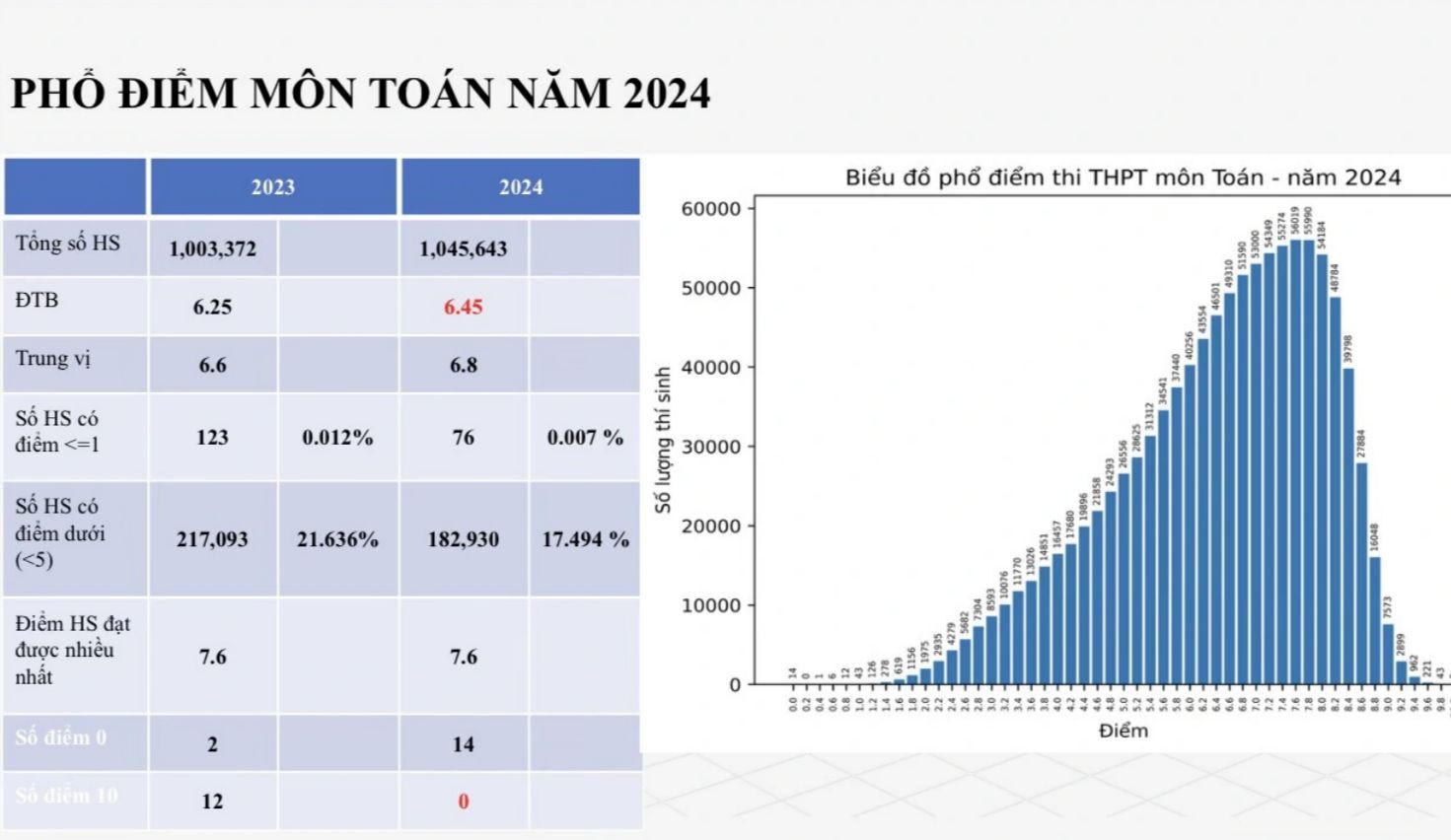 Môn Toán có 1.045.643 thí sinh dự thi. Điểm trung bình năm nay là 6,45 (năm 2023 là 6,25). Số điểm thí sinh đạt nhiều nhất là 7,6 điểm; có 76 thí sinh bị điểm liệt; trên 182.000 bài thi có điểm dưới trung bình (17,494%). Môn này không có thí sinh nào đạt điểm 10.