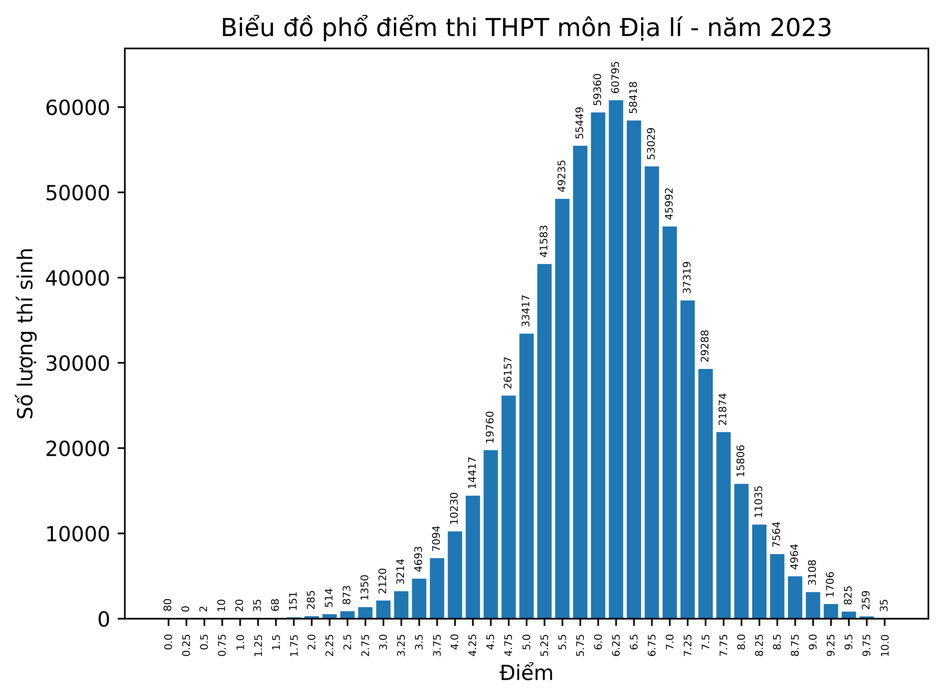 Điểm số có nhiều thí sinh đạt nhất là 6,25 điểm. Số thí sinh có điểm <= 1 là 112 (chiếm tỷ lệ 0.016%), trong khi số thí sinh đạt điểm dưới trung bình là 91,073 (chiếm tỷ lệ 13.35%). Năm nay cả nước có 35 thí sinh đạt điểm 10 môn Địa lý.