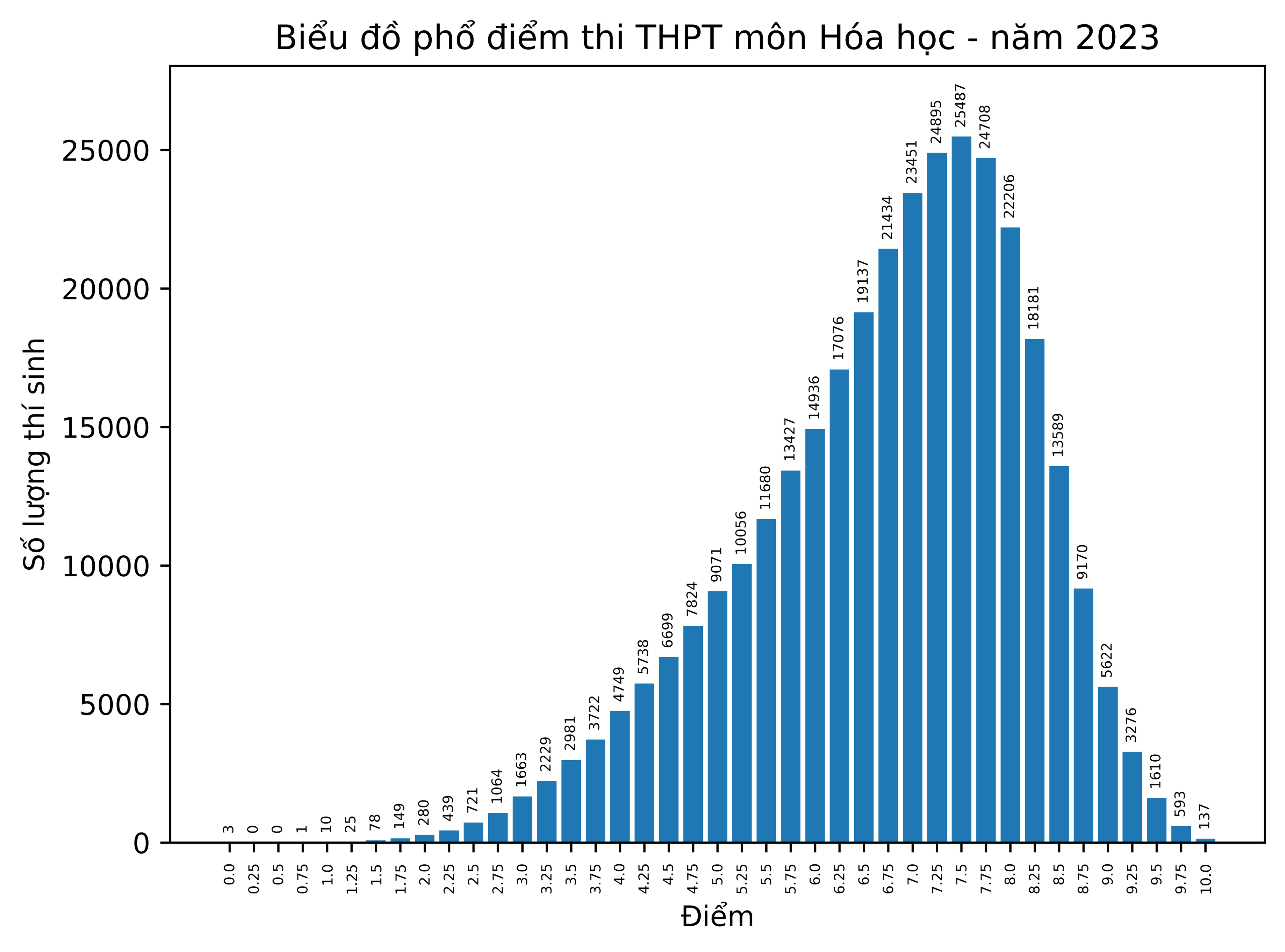 Năm nay có 328.117 thí sinh tham gia bài thi môn Hóa học, trong đó điểm trung bình là 6,74 điểm, điểm trung vị là 7,0 điểm. Cả nước có 137 thí sinh đạt điểm 10 và điểm số nhiều thí sinh đạt nhất là 7,5 điểm. Số thí sinh có điểm <= 1 là 14 (chiếm tỷ lệ 0,004%). Số thí sinh đạt điểm dưới trung bình là 38,375 (chiếm tỷ lệ 11,7%).