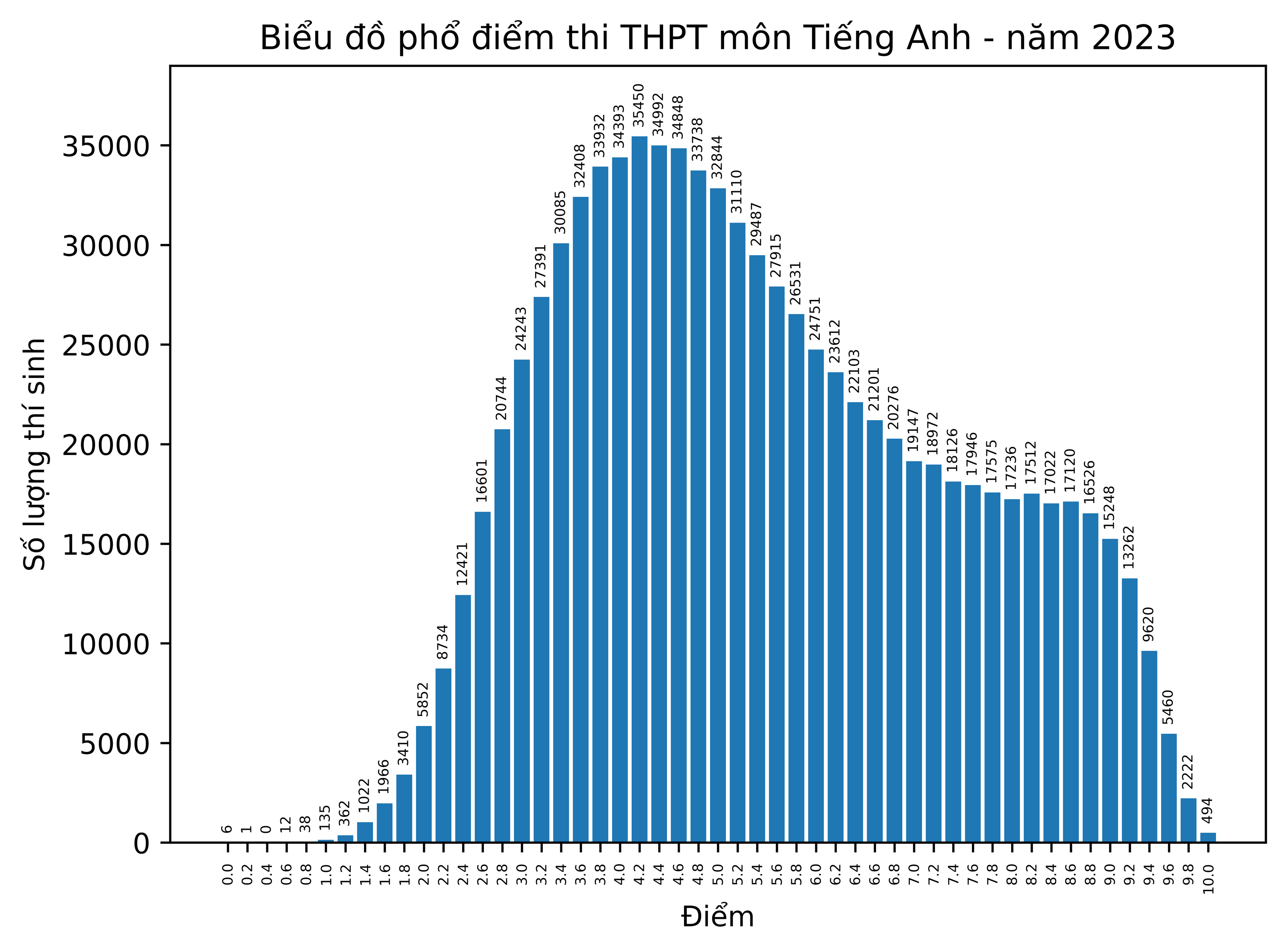 Kết quả phân tích môn Tiếng Anh cho thấy, đây là môn có điểm trung bình thấp nhất với 5,45 điểm. Điểm trung vị là 5,2 điểm, điểm số có nhiều thí sinh đạt nhất là 4,2 điểm. Cả nước có 876,102 thí sinh tham gia thi bài thi Tiếng Anh và có 494 em đạt điểm 10 tuyệt đối.