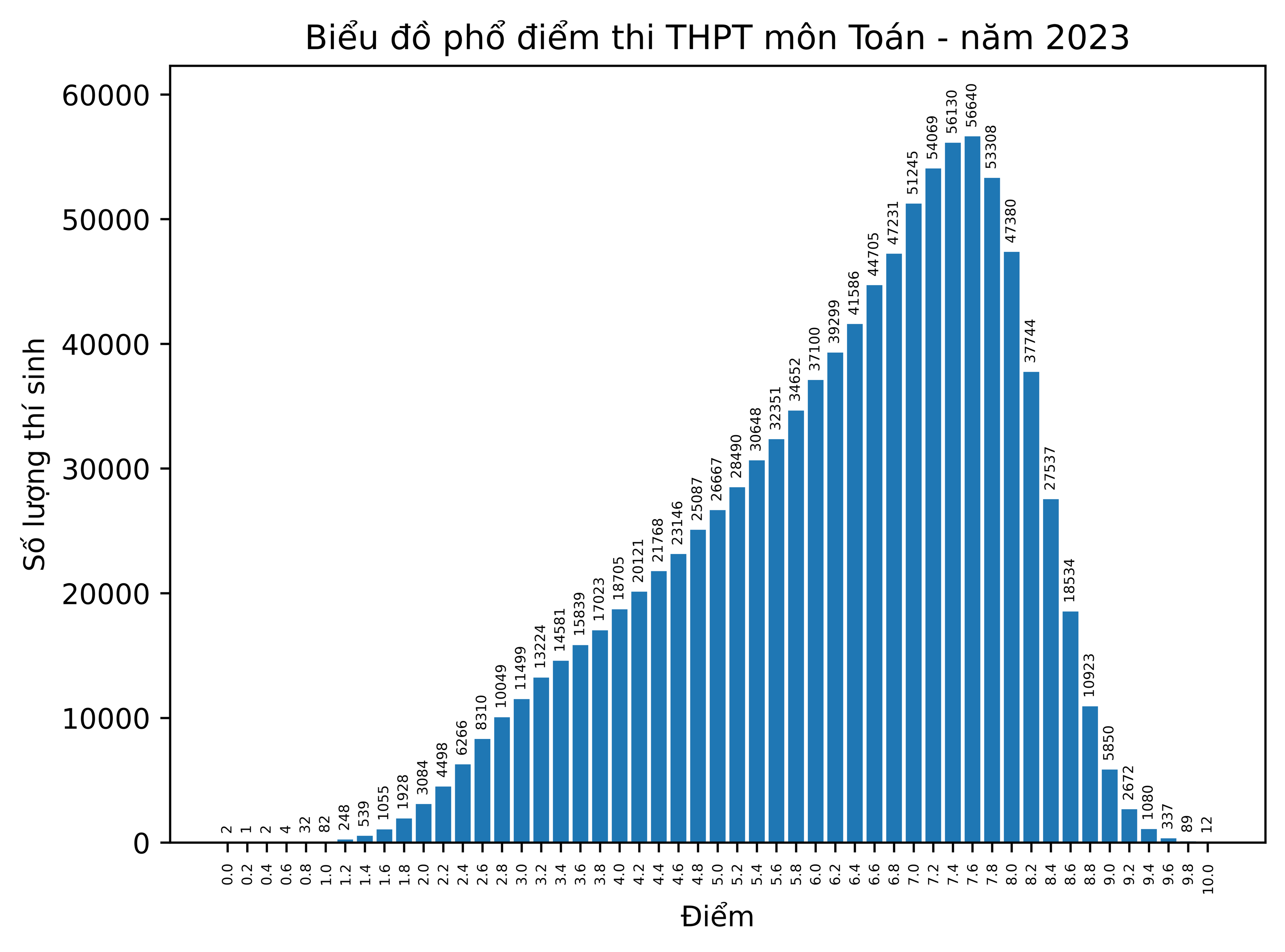 Số thí sinh có điểm <= 1 là 123 (chiếm tỷ lệ 0,012%); số thí sinh đạt điểm dưới trung bình là 217,093 (chiếm tỷ lệ 21,64%). Cả nước có 12 thí sinh đạt điểm 10 môn Toán.