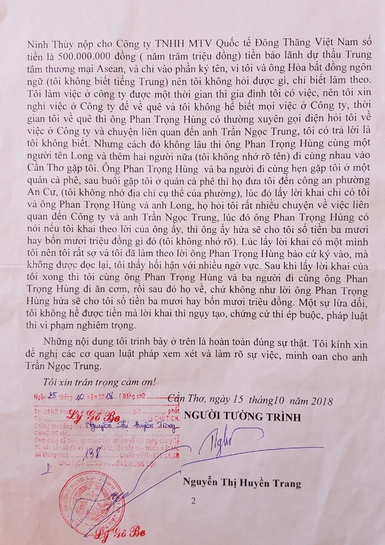 Vẫn lời chị Trang trình bày, ông Hùng sau đó thường xuyên gọi điện cho chị rồi cùng một người tên Long vào Cần Thơ gặp chị tại một quán cà phê. Sau đó đến Công an phường An Cư lấy lời khai: “Khi đó ông Hùng có nói nếu khai theo lời ông ấy thì ông ấy hứa sẽ cho 30 hay 40 triệu gì đó. Lúc lấy lời khai, tôi chỉ có một mình nên sợ và làm theo”, Trang viết trong đơn và nói sau khi lấy lời khai xong thì ký tên chứ không được đọc lại. Sau buổi làm việc chị có đi ăn cùng nhóm người của ông Hùng, không được cho tiền như đã hứa”.