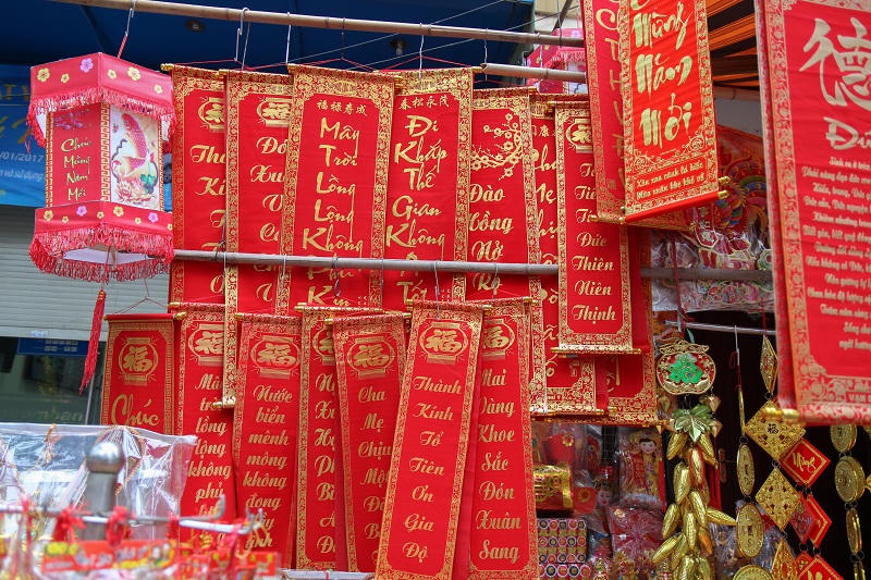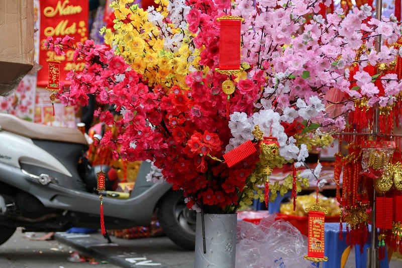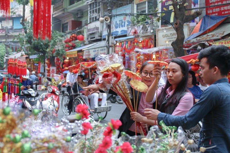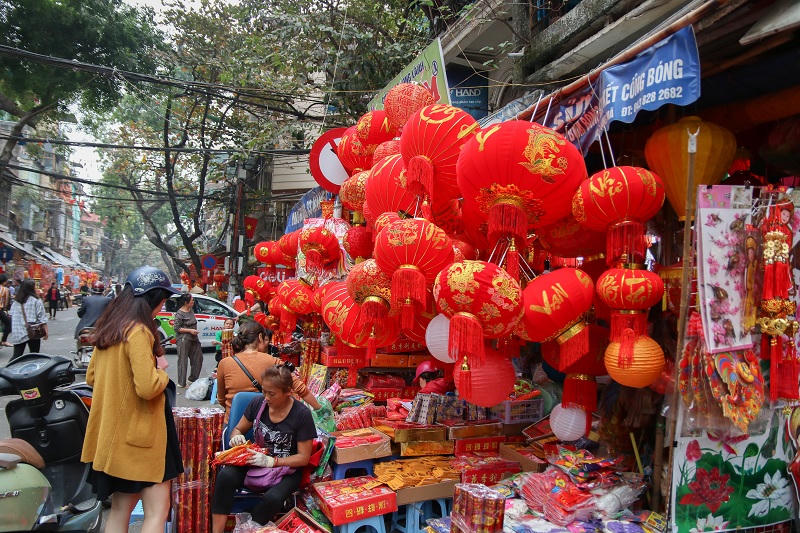 Đến hẹn lại lên, phố Hàng Mã - Hàng Lược - Hàng Cân (quận Hoàn Kiếm, Hà Nội) rực rỡ bởi sự xuất hiện của các loại đồ trang trí cho dịp Tết khá đa dạng như: đèn lồng đỏ, câu đối xuân, tranh dán, cành đào, cành mai, dây treo cây, bao lì xì,…