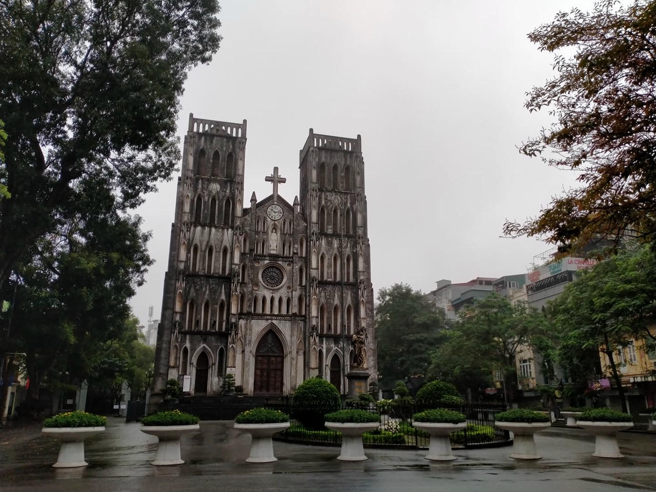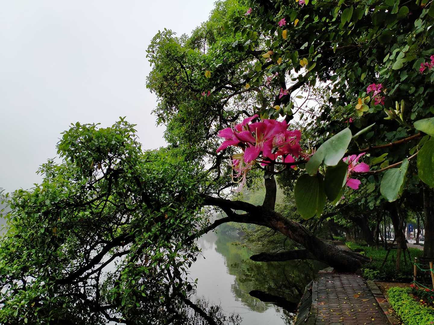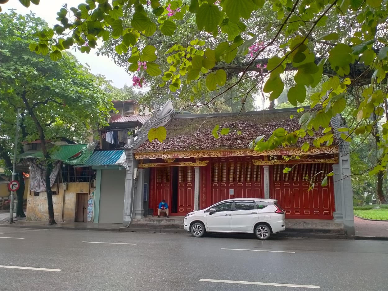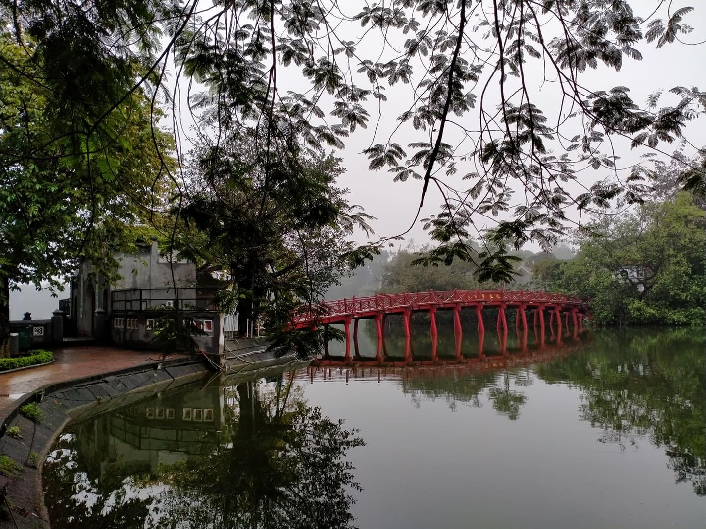 Tôi dừng xe ở Bờ Hồ, nơi được coi là "trái tim của Thủ đô". Tháp Rùa lặng im, trầm mặc trong mưa bụi. Xung quanh Bờ Hồ chỉ có những người lao công cần mẫn làm việc, không một dáng người tản bộ, tập thể thao hay ngồi trên ghế đá trò chuyện. Cầu Thê Húc không khách ghé thăm, đền Ngọc Sơn cửa đóng then cài.