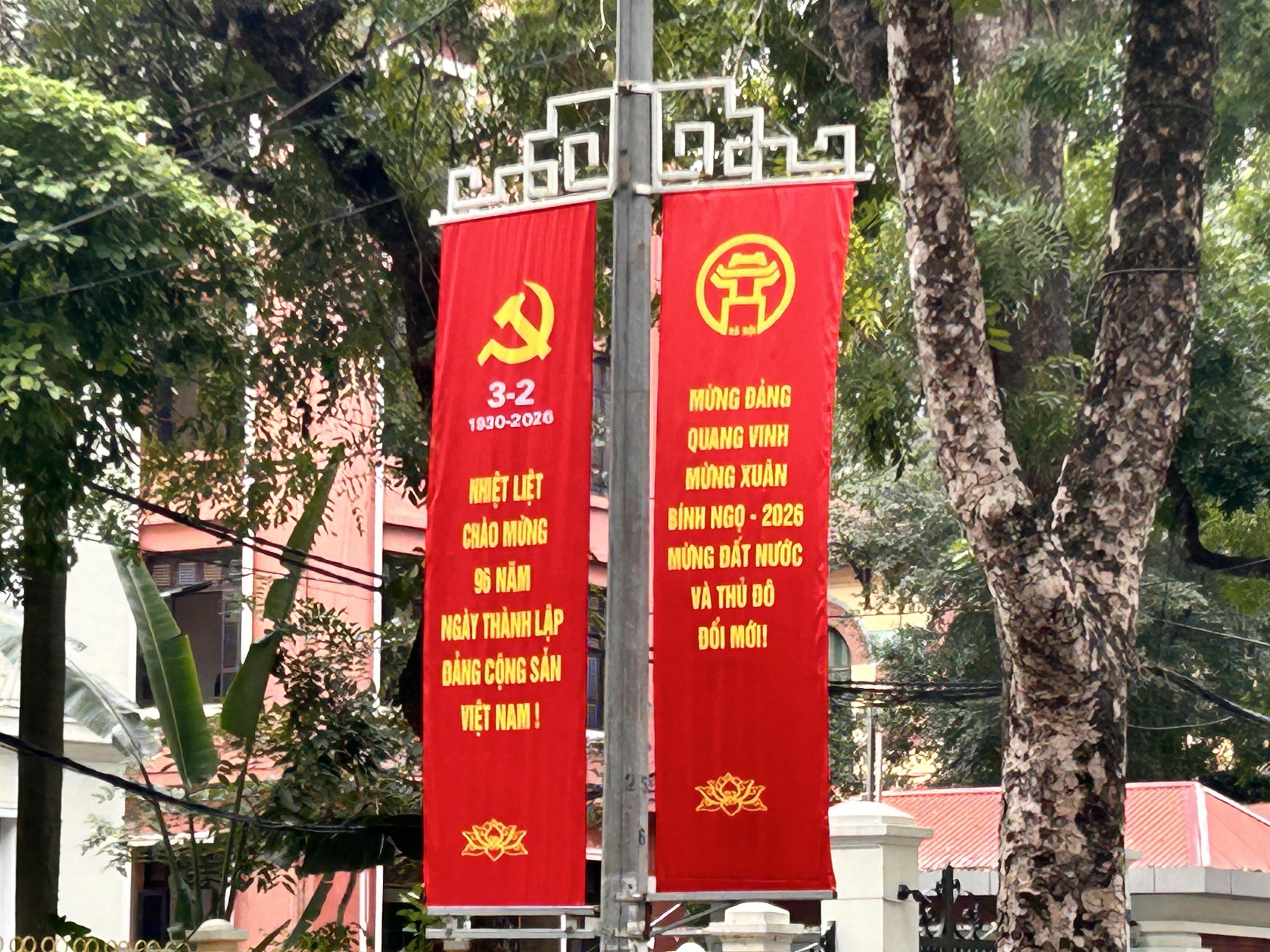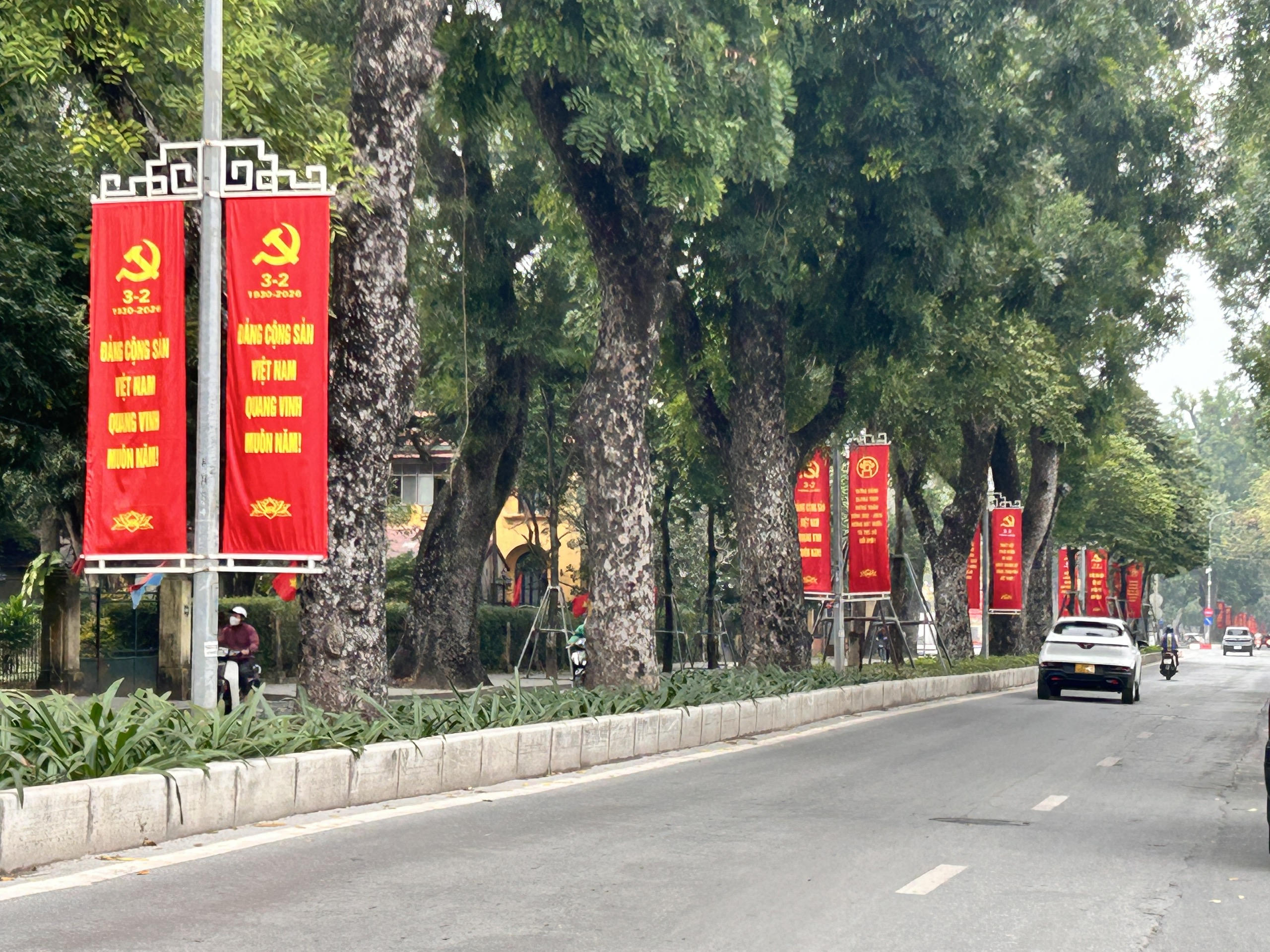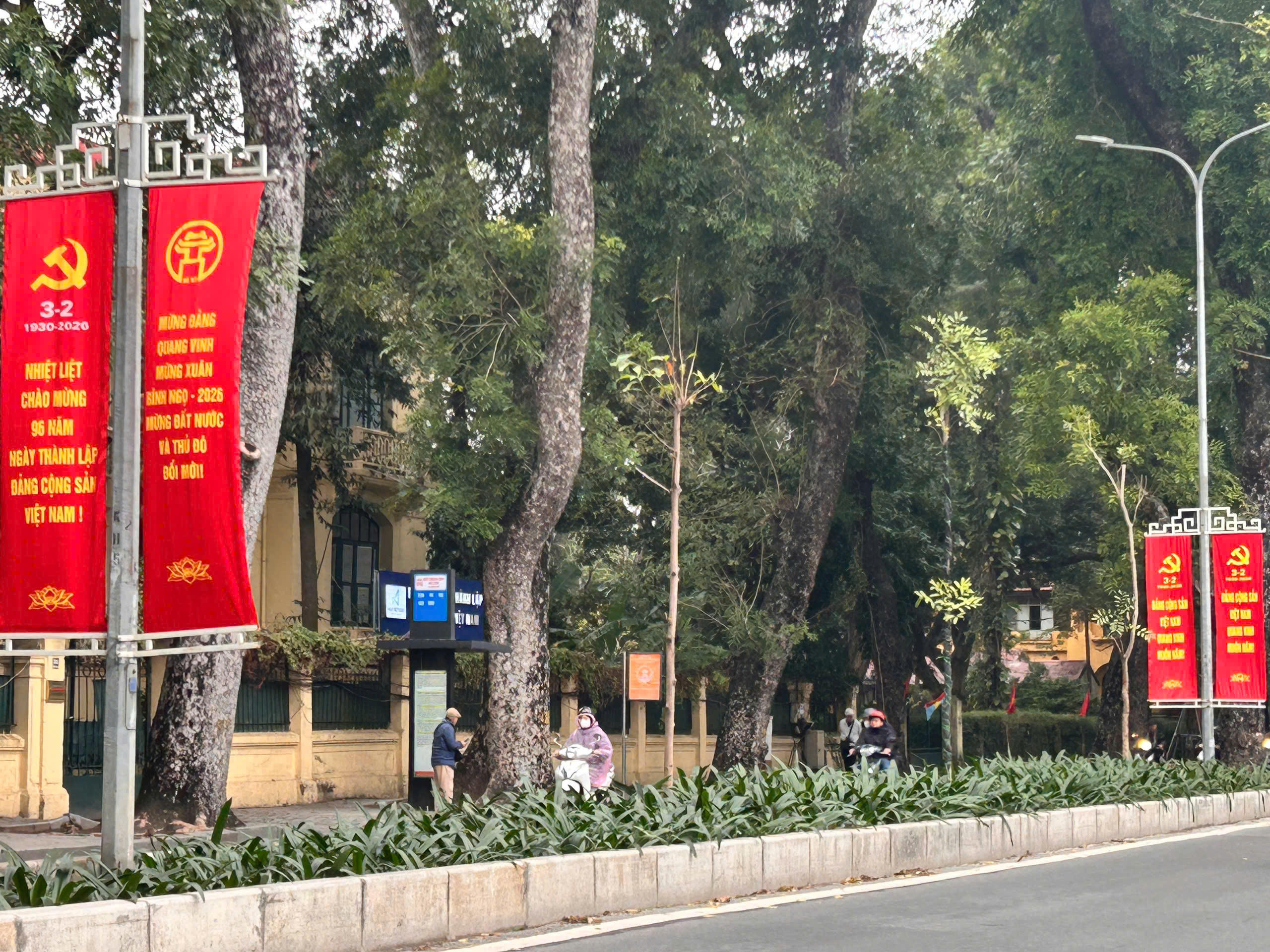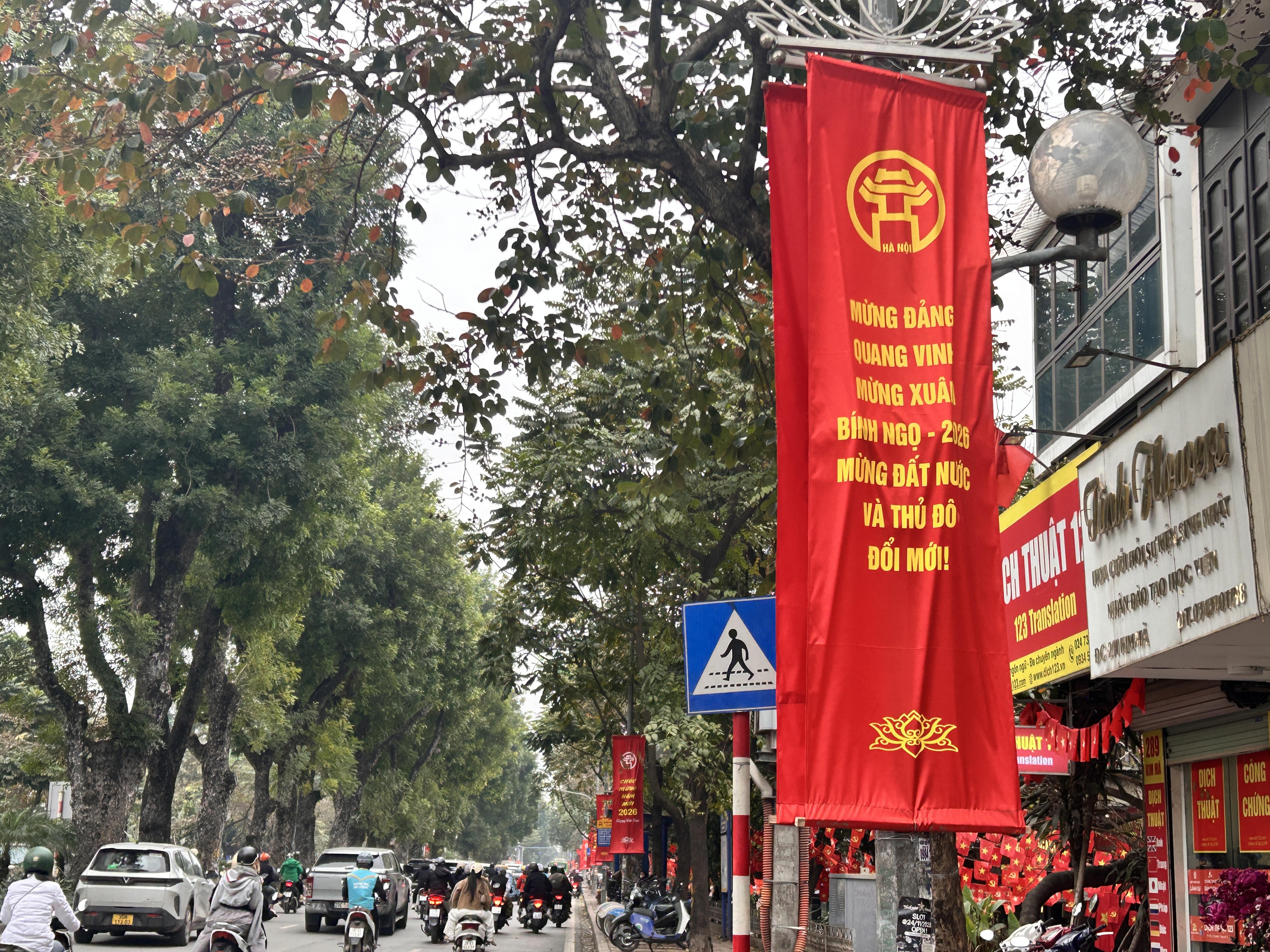 Dọc các tuyến phố trung tâm như Nguyễn Chí Thanh, Kim Mã, những dải băng rôn đỏ thắm với dòng chữ chúc mừng năm mới, mừng Đảng – mừng Xuân được treo ngay ngắn trên các cột đèn, dải phân cách. Màu đỏ, vàng chủ đạo tạo nên sắc xuân rực rỡ, nổi bật giữa nền trời những ngày cuối năm. Tại Hoàng Diệu và Phan Đình Phùng, hệ thống băng rôn, kết hợp biểu tượng năm mới và các thông điệp chào xuân thu hút sự chú ý của người dân qua lại.