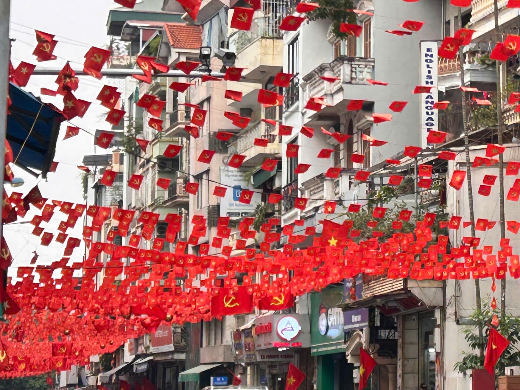 Ở phía bên kia sông Hồng, các tuyến Ngọc Lâm, Nguyễn Văn Cừ, Ngô Gia Tự và Hội Xá cũng được trang trí đồng loạt. Cờ Tổ quốc, cờ Đảng xen kẽ cùng băng rôn khẩu hiệu tạo nên không khí trang nghiêm nhưng không kém phần rộn ràng. Nhiều người dân tranh thủ ghi lại hình ảnh phố phường rực rỡ sắc màu trong những ngày cận Tết.