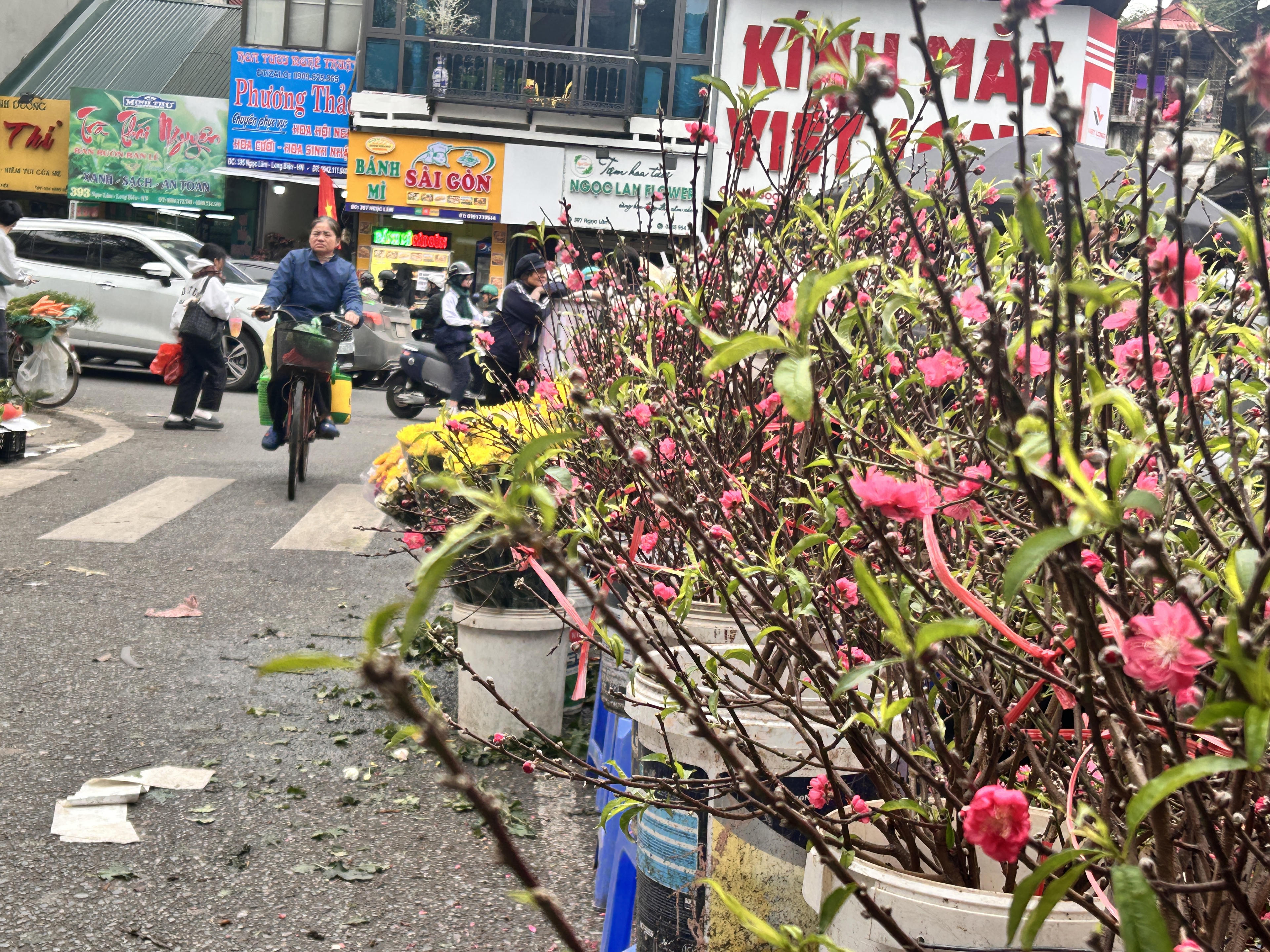 Tại khu vực chợ hoa Gia Lâm, sắc xuân đã thực sự “xuống phố” khi những cành đào Nhật Tân được bày bán dọc lối vào và khắp các gian hàng. Từng nụ đào chúm chím, cánh hoa hồng thắm rung rinh trong gió nhẹ, tạo nên khung cảnh rực rỡ, báo hiệu Tết đang cận kề. Nhiều tiểu thương tất bật vận chuyển, sắp xếp những gốc đào thế, đào cành đủ kích thước phục vụ nhu cầu người dân. Dòng người tham quan, lựa chọn đào đông dần theo từng giờ, ai cũng mong tìm được một cành ưng ý để mang hương sắc mùa xuân về nhà, chuẩn bị đón một năm mới an khang, sum vầy.