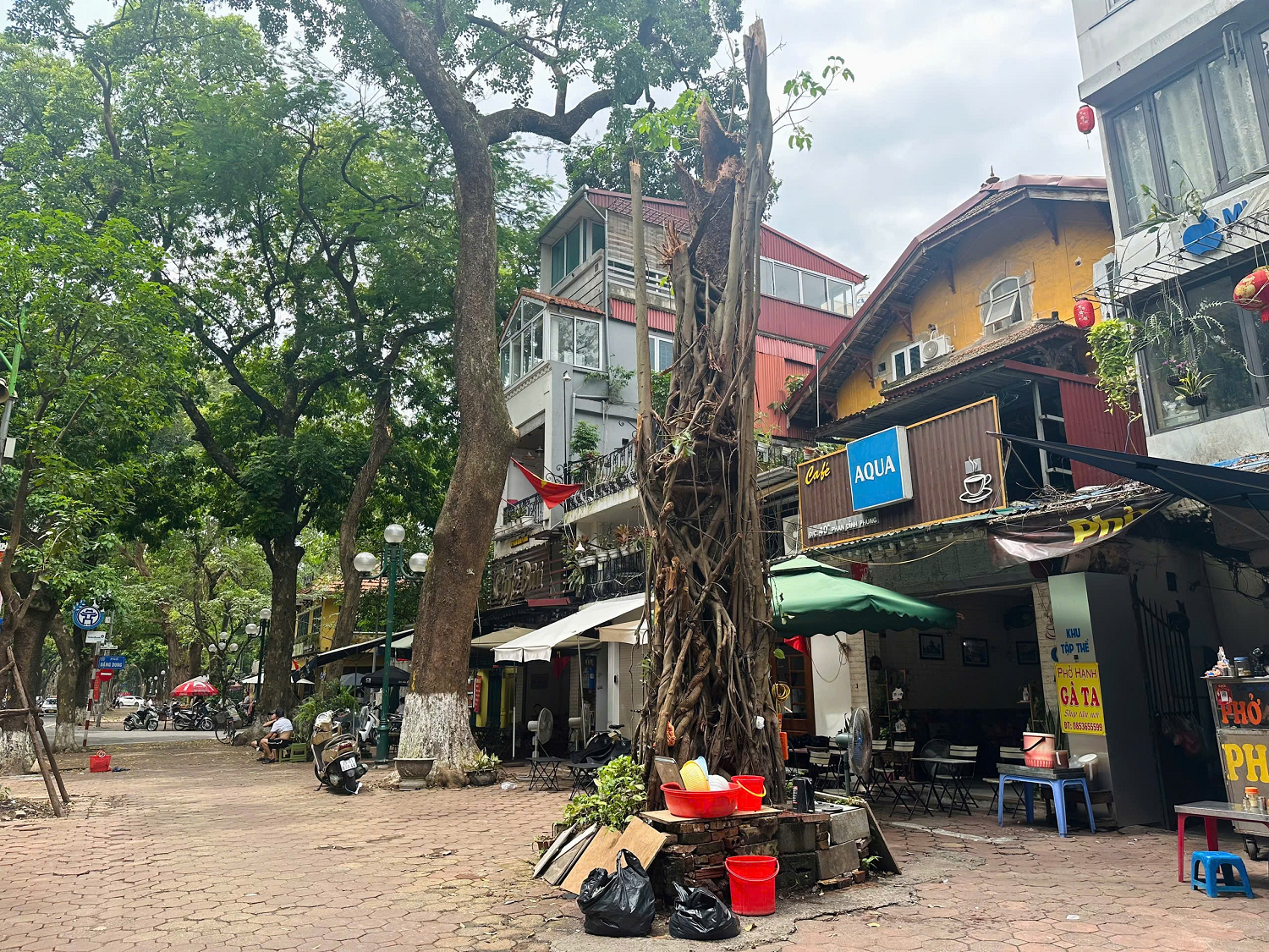Cây xanh bật gốc, đổ ngang trên phố Cửa Bắc đã được di dời, đảm bảo giao thông thông suốt. |