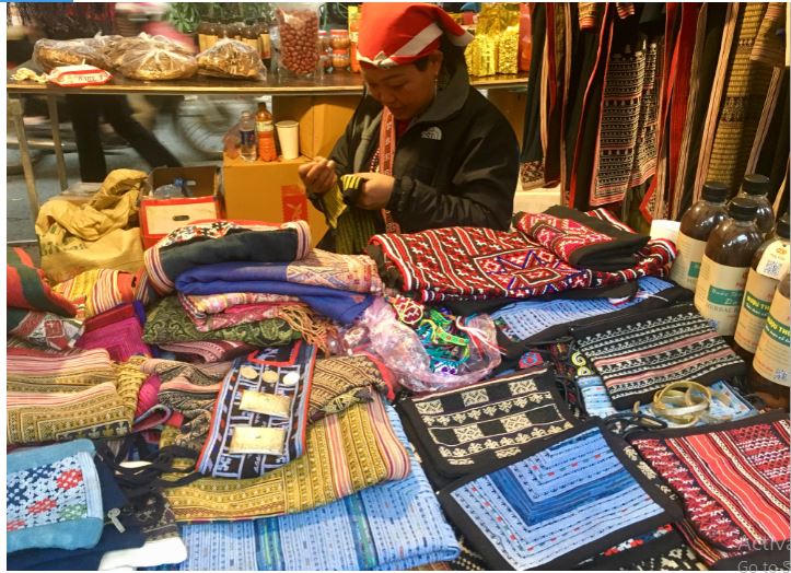 Đối lập với vẻ đẹp duyên dáng, thanh tao của của những nét chữ thư pháp bay bổng, đi dọc theo chiều dài con phố, ở cuối cùng của con đường bích họa là những gian hàng nhỏ nhắn, ấm áp với hàng loạt món đồ thổ cẩm của người dân tộc. Các chị hầu hết đều là những người dân tộc thiểu số sinh sống tại những vùng như Lào Cai, Sa Pa,… đến với chợ hoa Tết năm nay, các chị đem đến những sản phẩm thủ công đặc trưng của dân tộc mình.