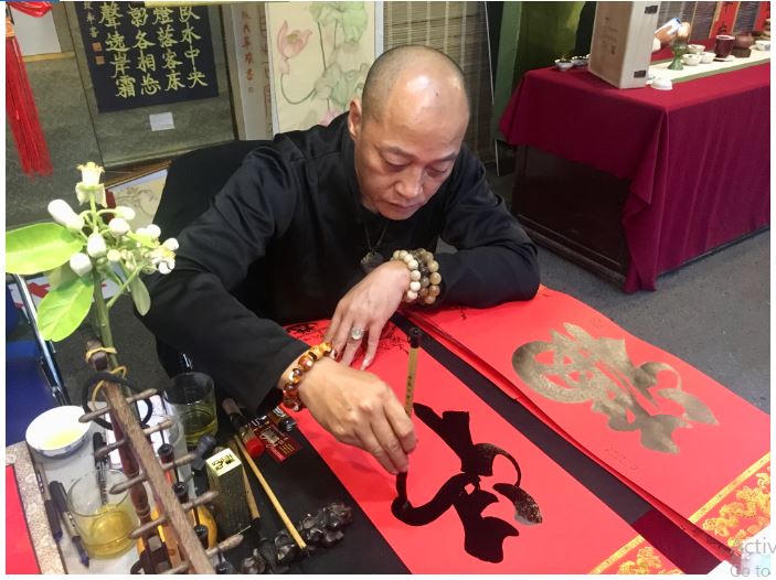 Đi dọc tuyến phố, du khách dễ dàng bị thu hút đầu tiên ở quầy thư pháp, với những xấp giấy đỏ, mực tàu, nghiên bút được bày biện gọn gàng, điểm xuyết bằng bàn trà nhỏ, bên cạnh cây mai trắng đang độ nở hoa. Ông Xuân Quỳnh – một nghệ nhân viết thư pháp đã có hơn hai mươi năm tu dưỡng chia sẻ: “Tôi học viết thư pháp vì đam mê, còn những thầy đồ ở đây, các cụ đã có đến ba mươi, bốn mươi năm tu dưỡng”.