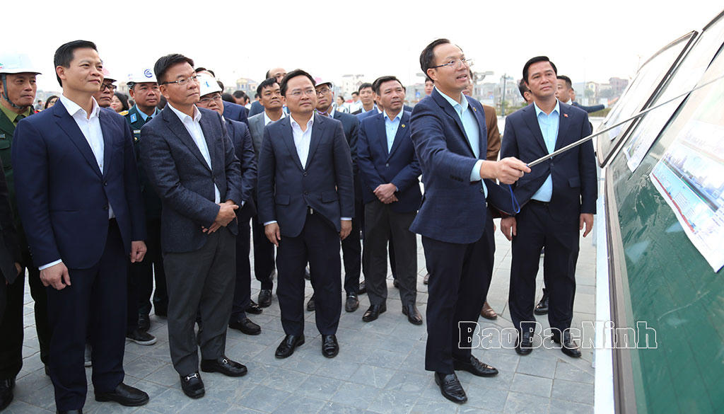 Phó Thủ tướng Lê Thành Long và lãnh đạo tỉnh Bắc Ninh nghe giới thiệu tiến độ xây dựng Trường Đại học Luật Hà Nội cơ sở 2 tại phường Đồng Nguyên, thành phố Từ Sơn |