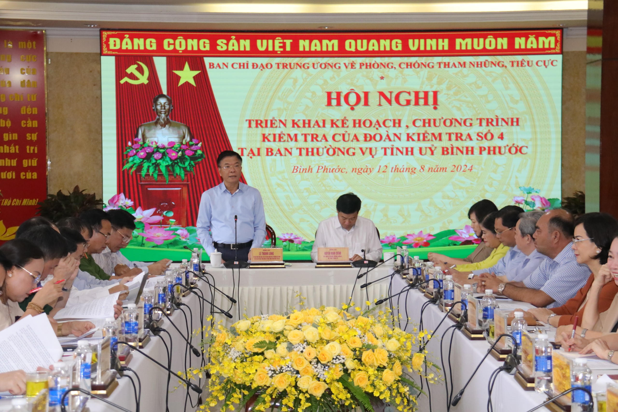 (PLVN) - Sáng 12/8, tại Bình Phước đã diễn ra Hội nghị Triển khai kế hoạch, chương trình kiểm tra của Đoàn kiểm tra số 4 về công tác phòng chống tham nhũng và tiêu cực ở địa phương...
